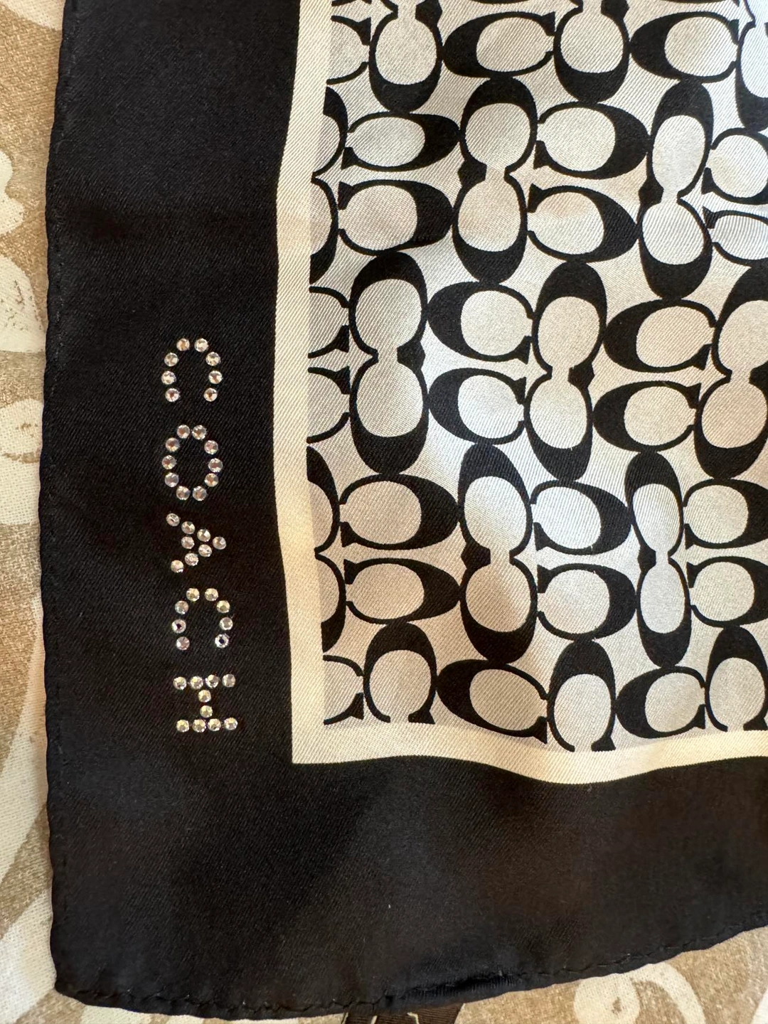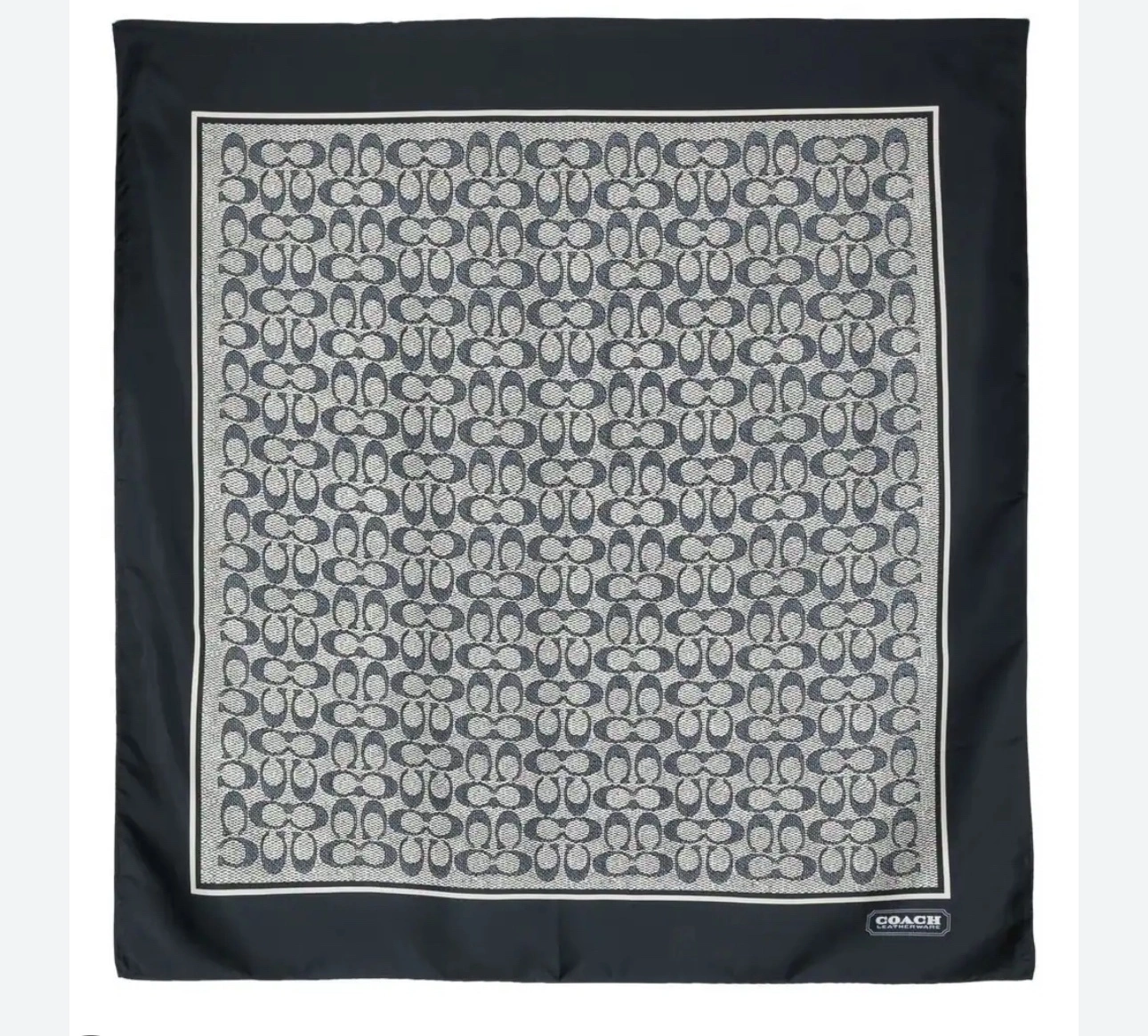 22 Inch square black and white CLASSIC silk scarf. Never worn… comes with dust bag. Coach monogram is found in bottom right corner and sparkles! See photo