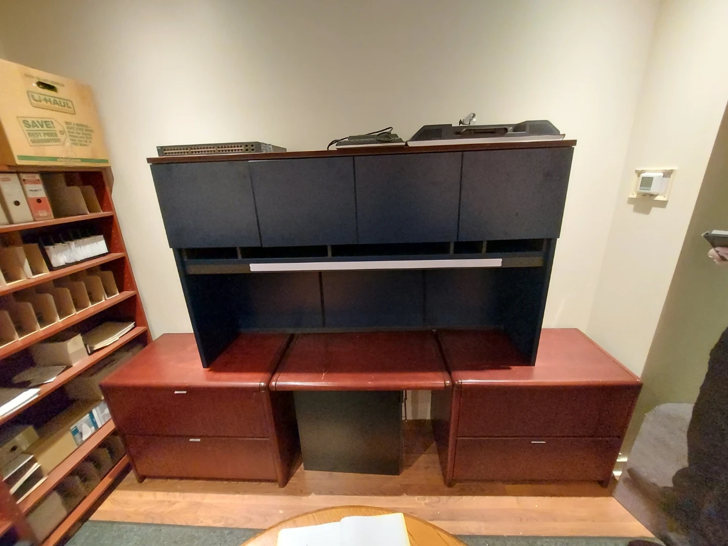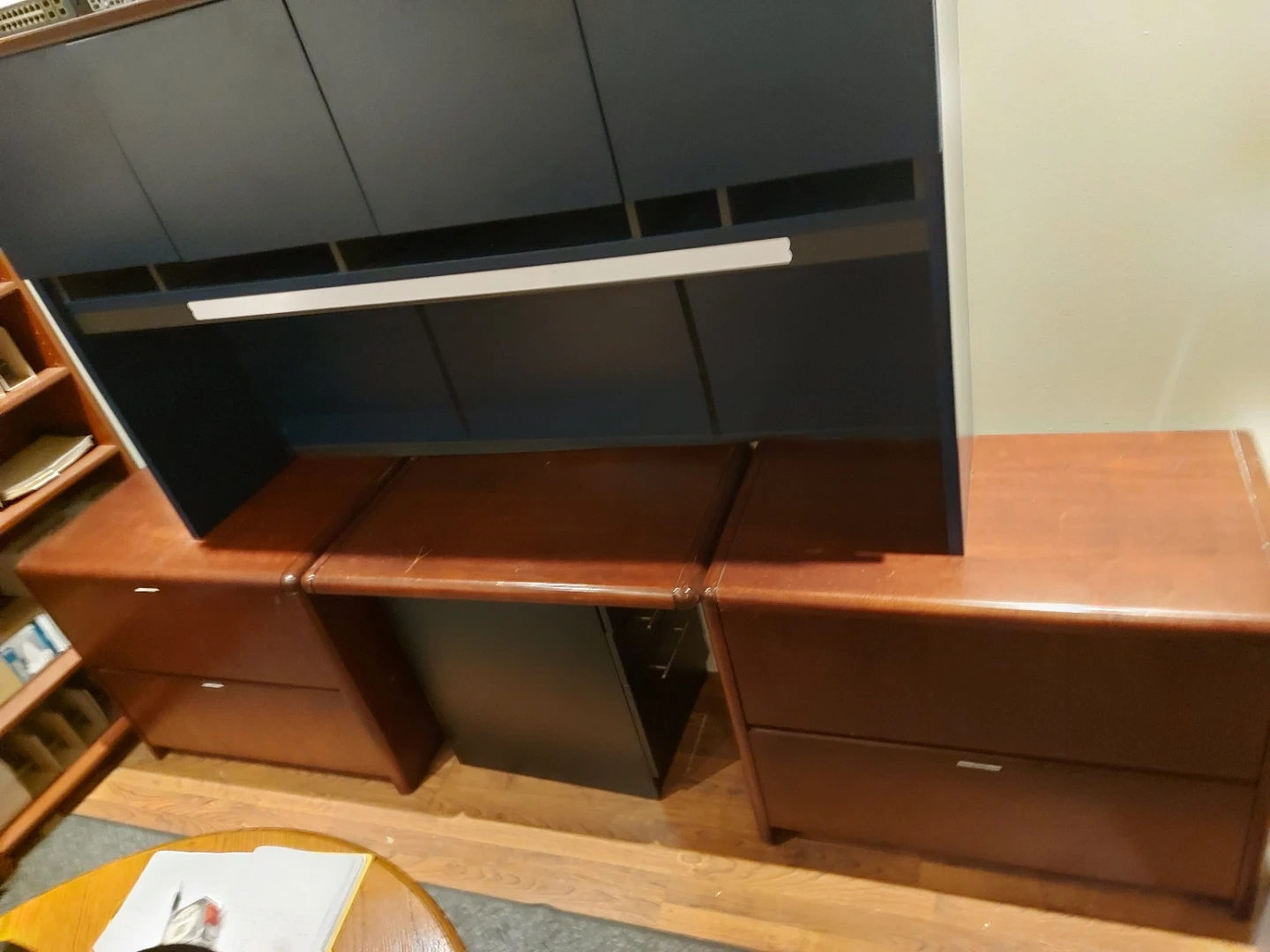 Large red/brown real wood desk with four large cabinets. Does not include the hutch seen in photos.