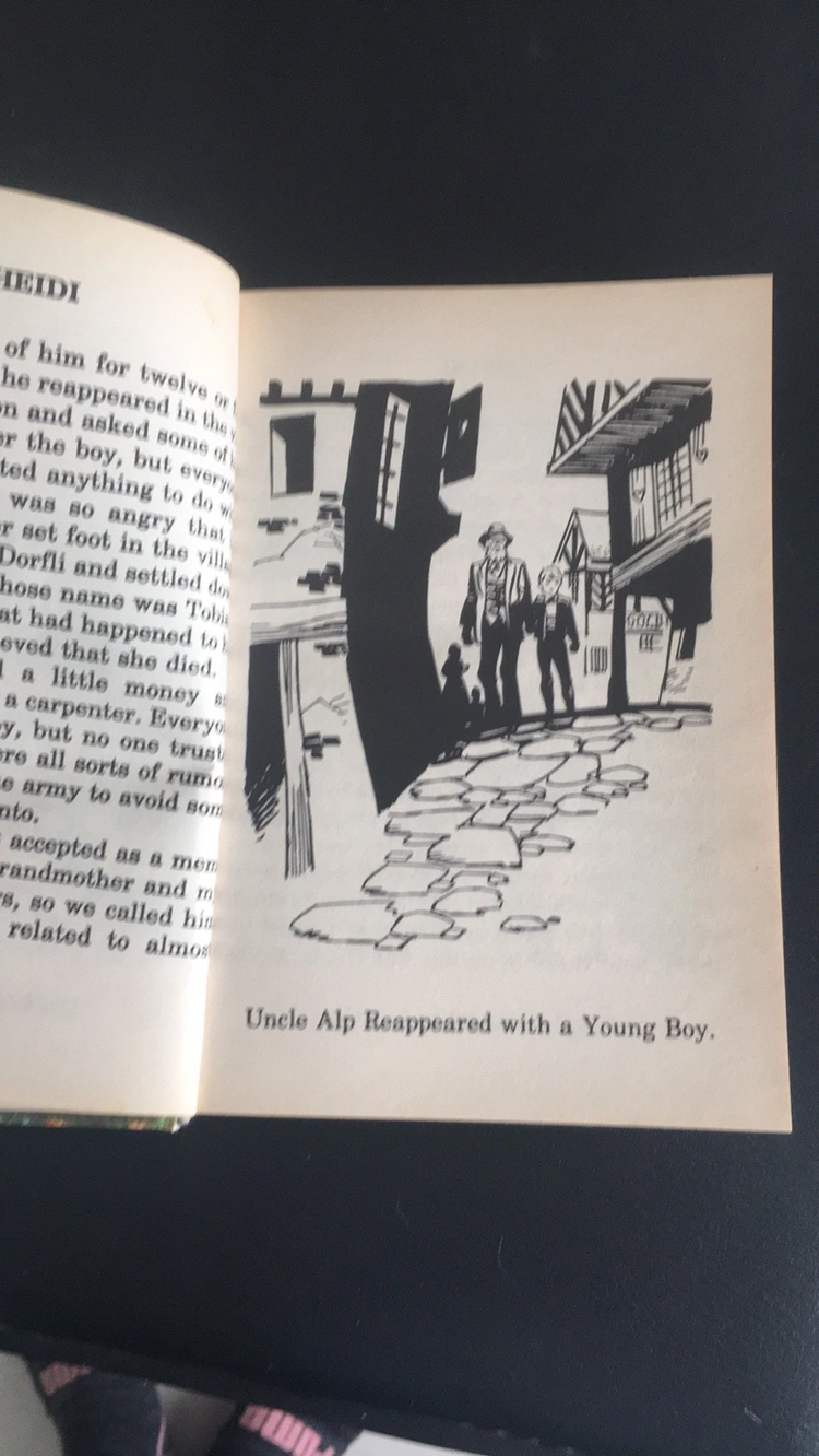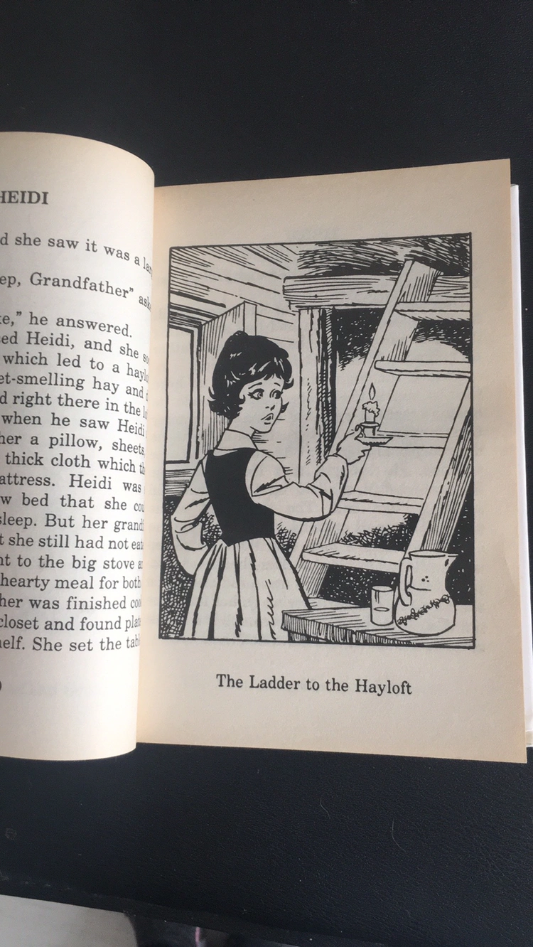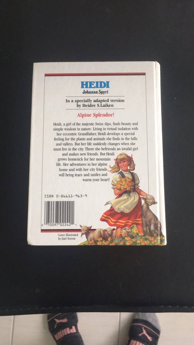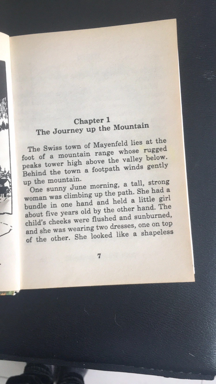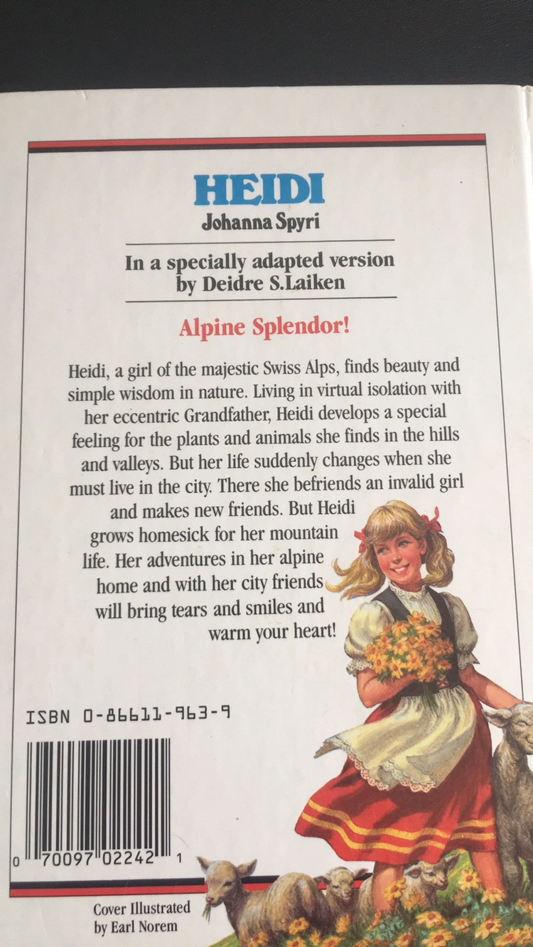 “Heidi” with 22 chapters is easy to read and is captivating for children around ten years old upward and adults alike. Goats, goatherds, the beautiful Alps, and a spoilt girl waited upon by servants and a Governess, appear in this wonderful story.