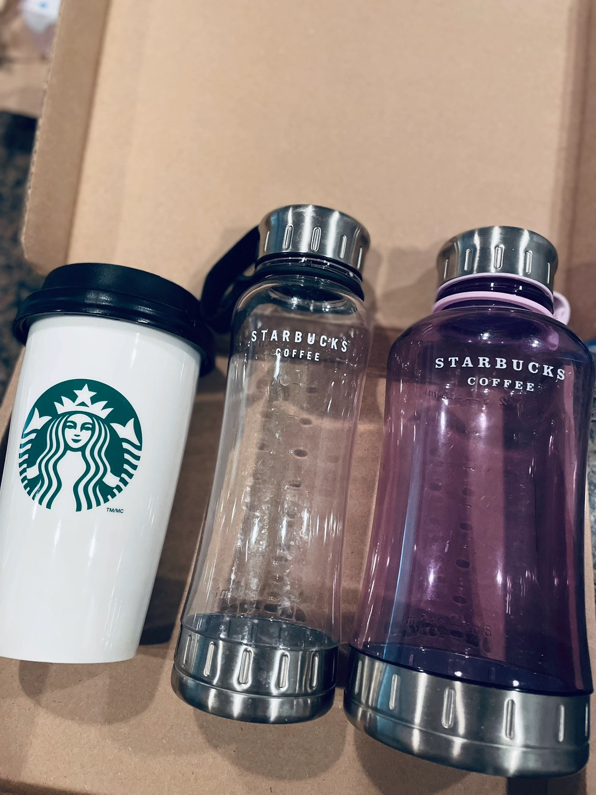 Starbucks ceramic tumblerx1, water bottlesx2