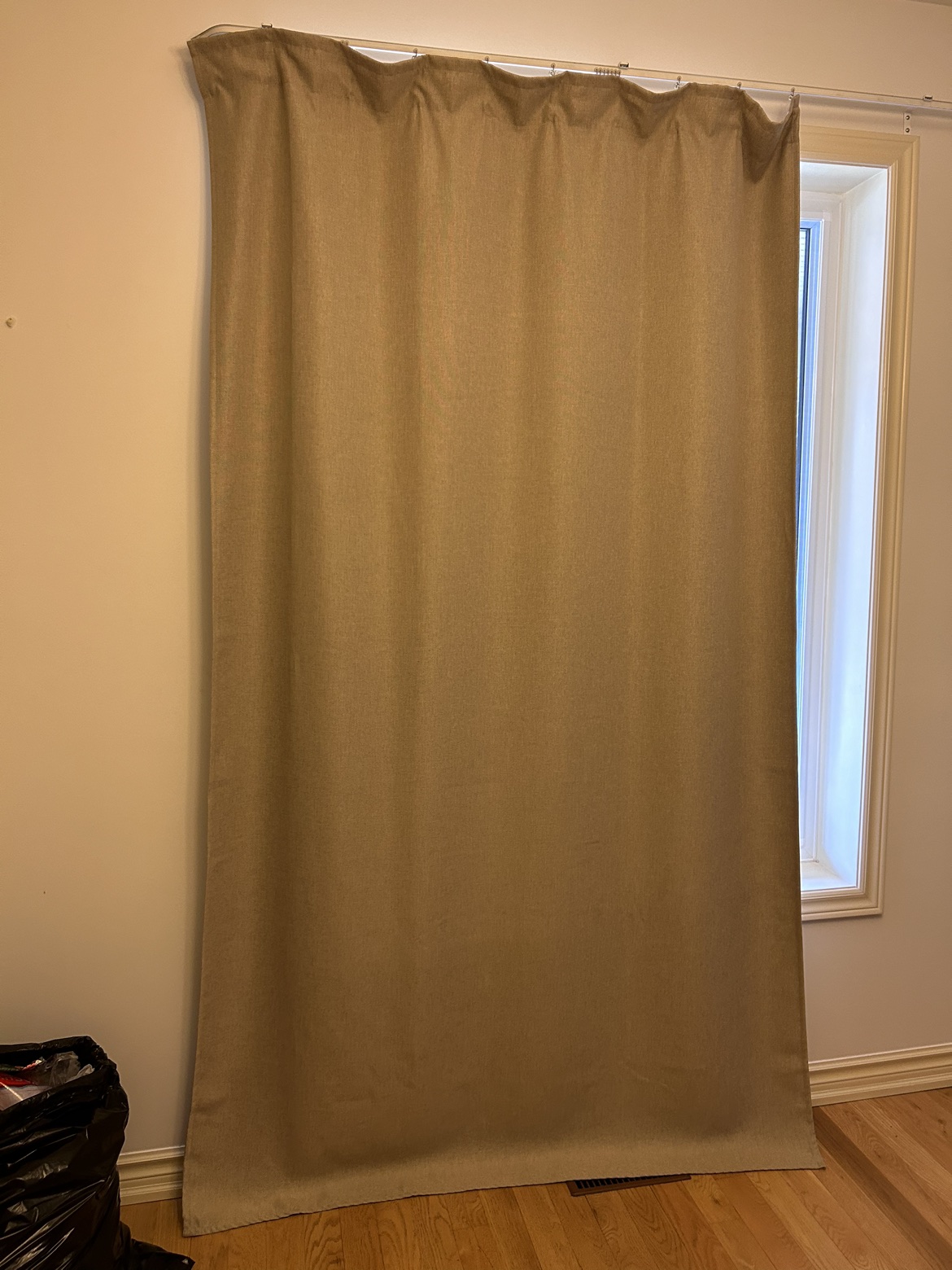 The densely woven curtains darken the room and provide privacy by preventing people outside from seeing into the room.