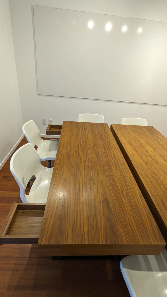 Includes two drawers on a side, chairs not included.