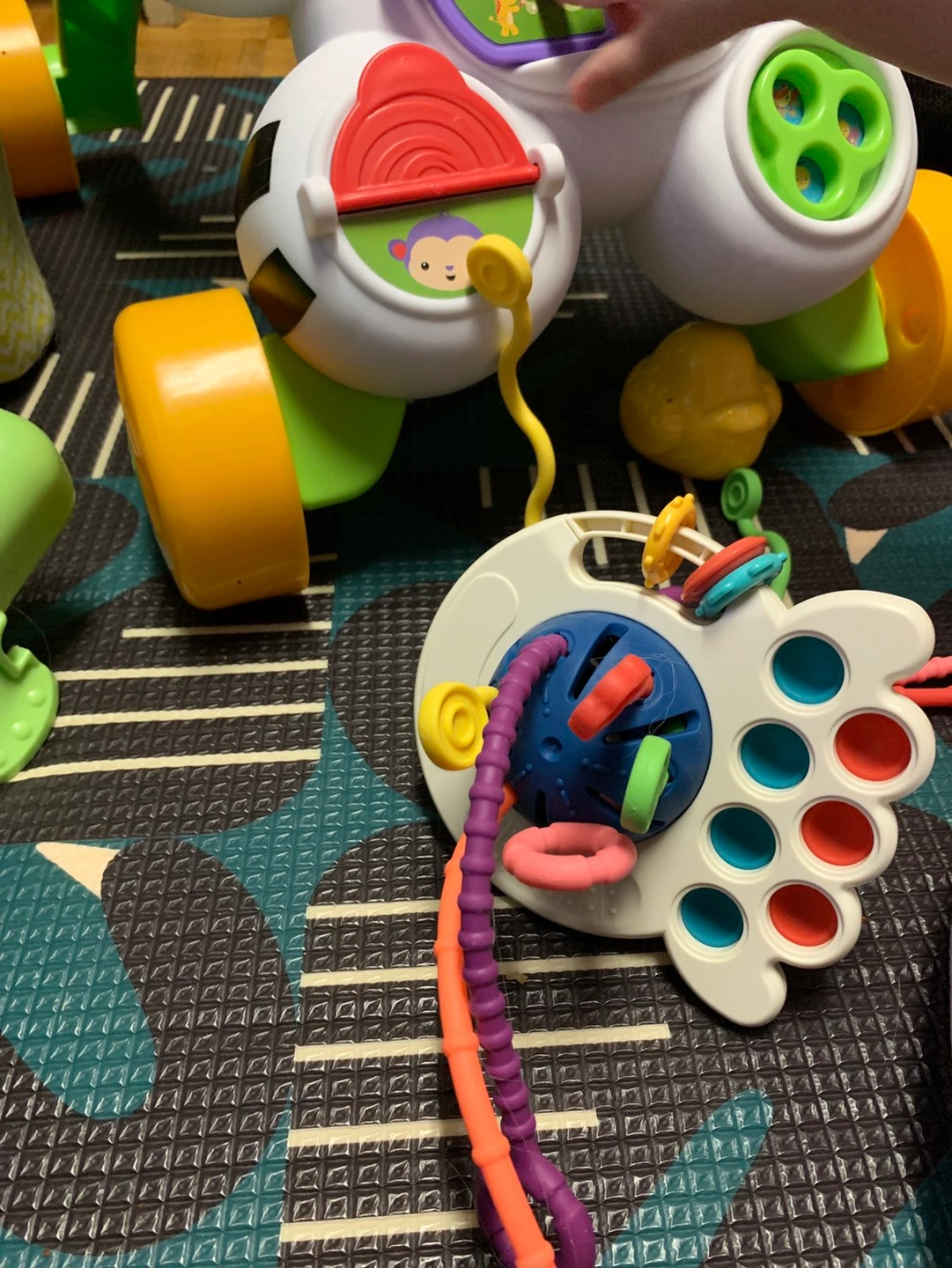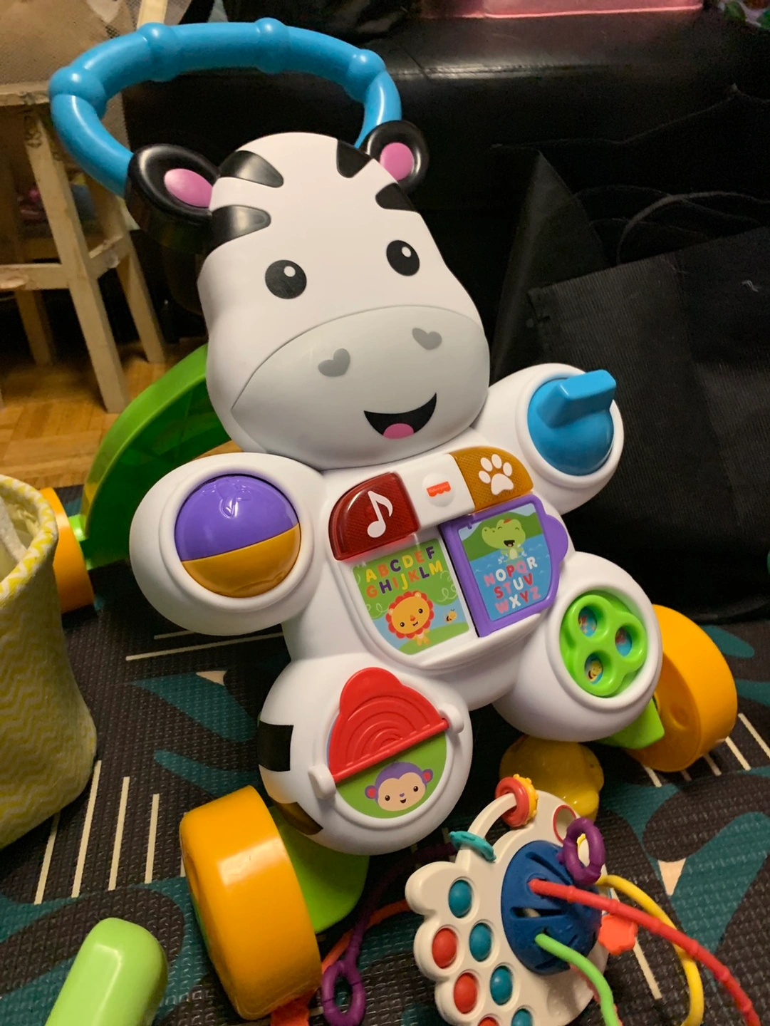 3 weeks for the zebra Walker. Used sparingly. Baby not as interested.