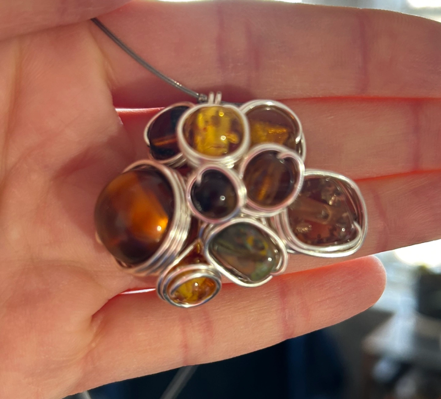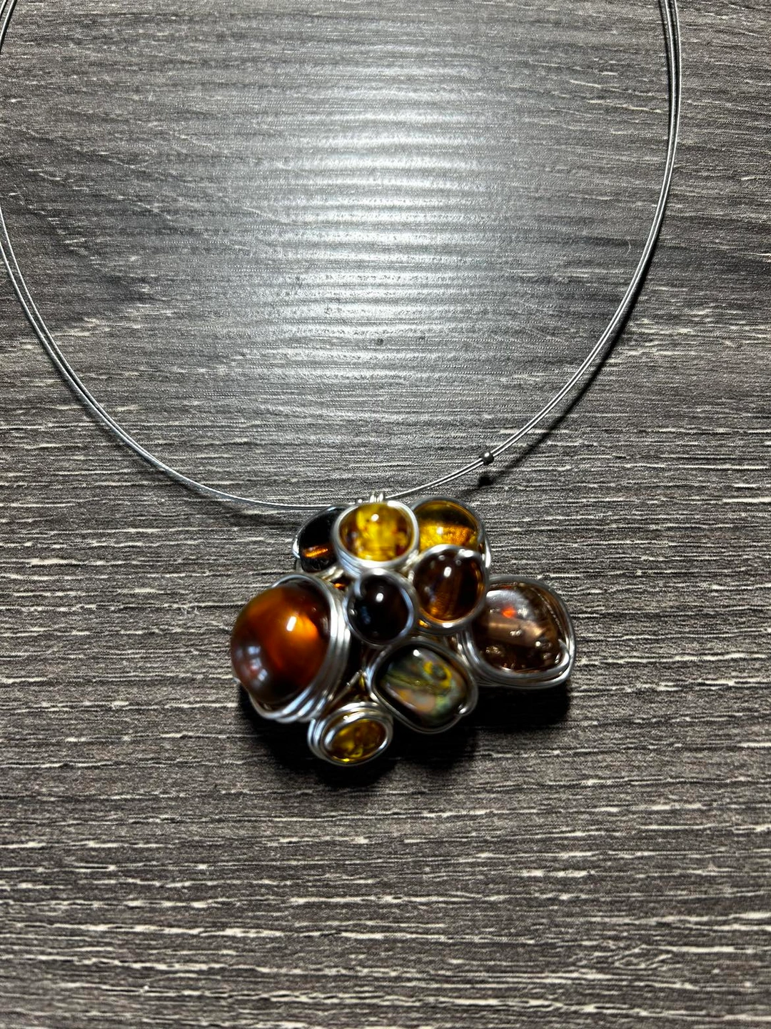 - Gorgeous, unique cluster of stones—tiger’s eye, amber, agate—in sterling silver wire setting with sterling wire necklace