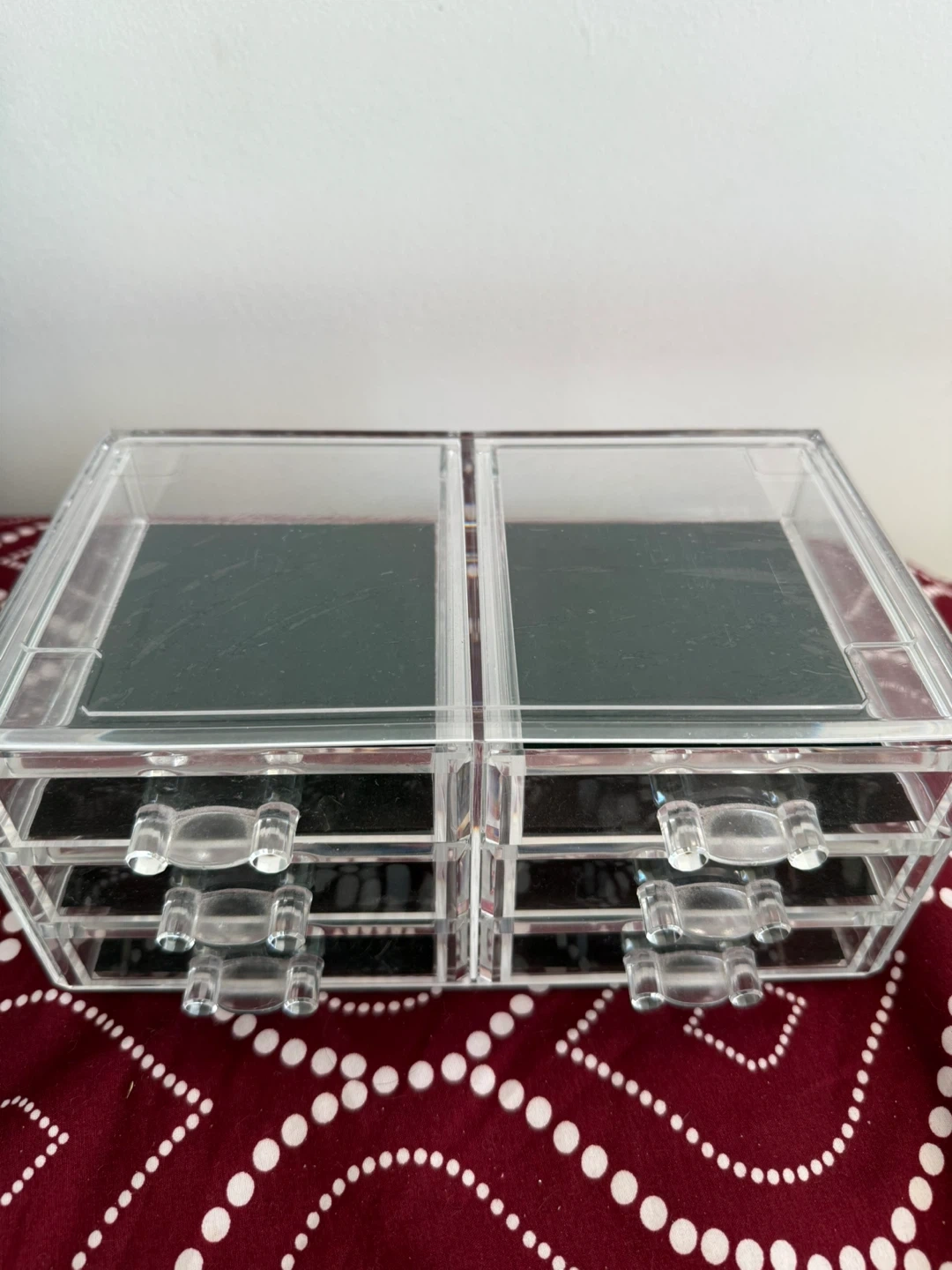 Clear acrylic makeup organizer with six drawers. It's great for storing cosmetics and accessories. The drawers offer easy access to your beauty essentials.