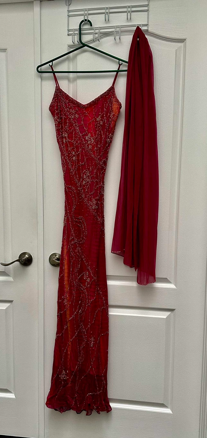 Fuchsia colour beaded chiffon evening long dress w/shawl