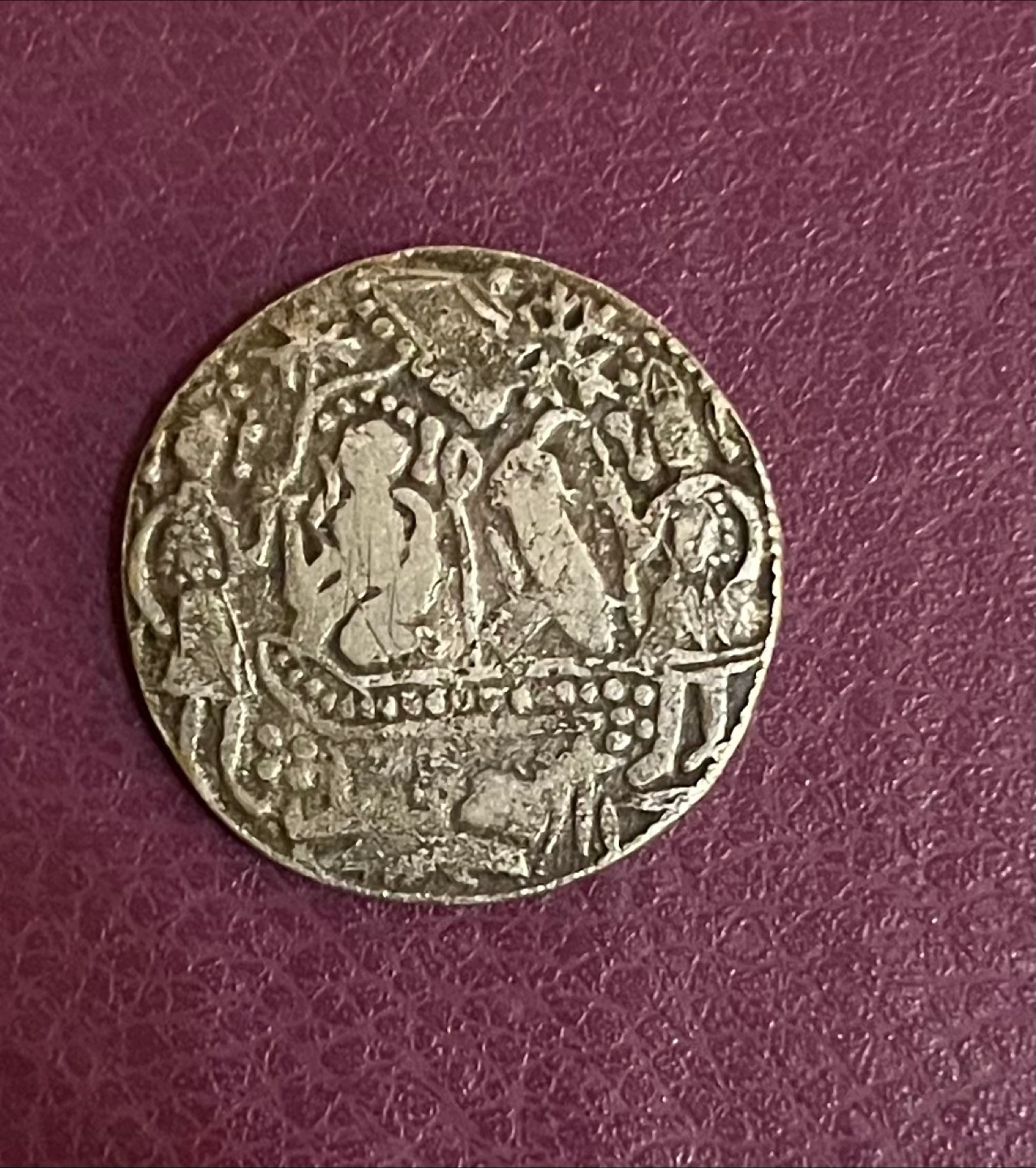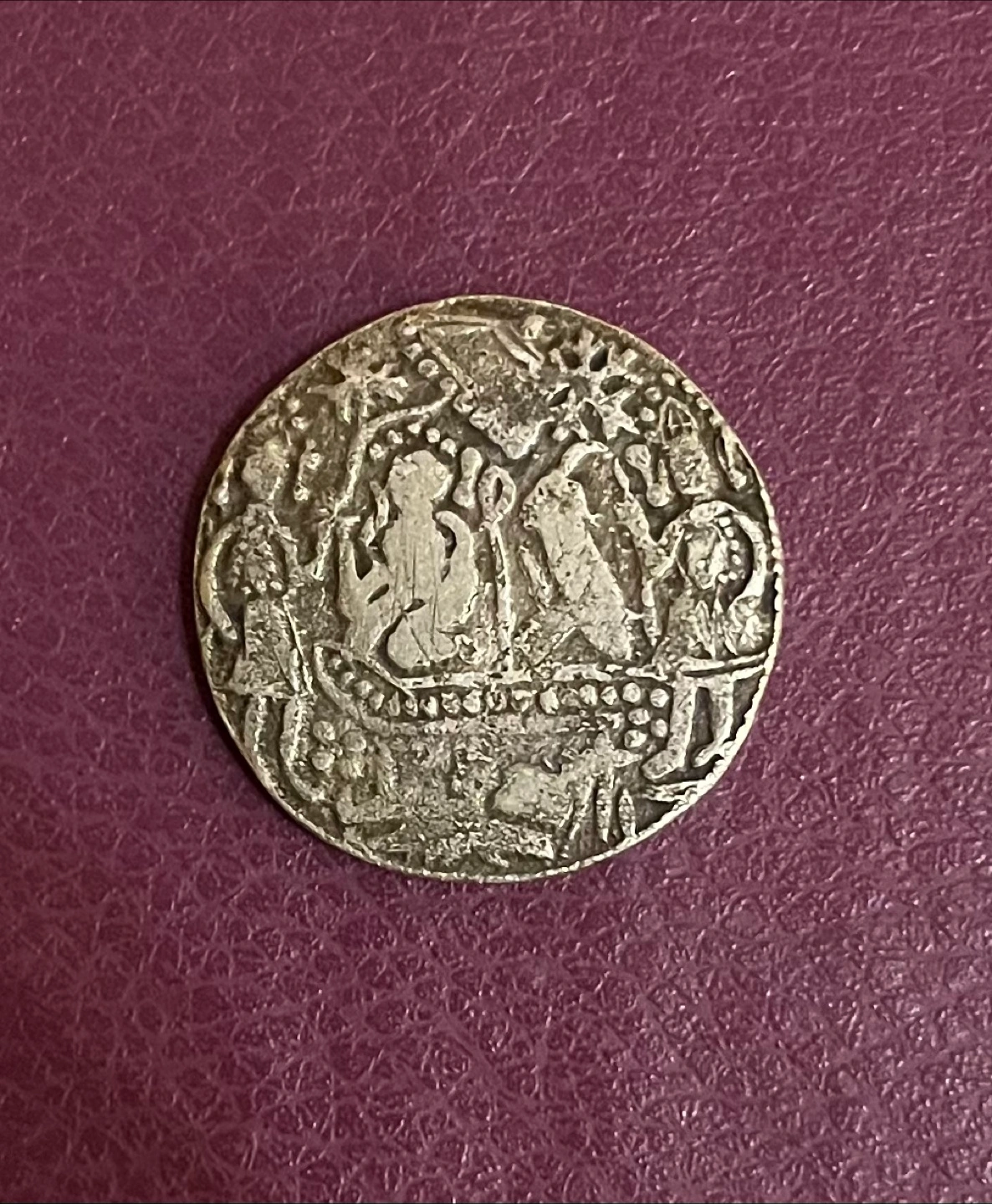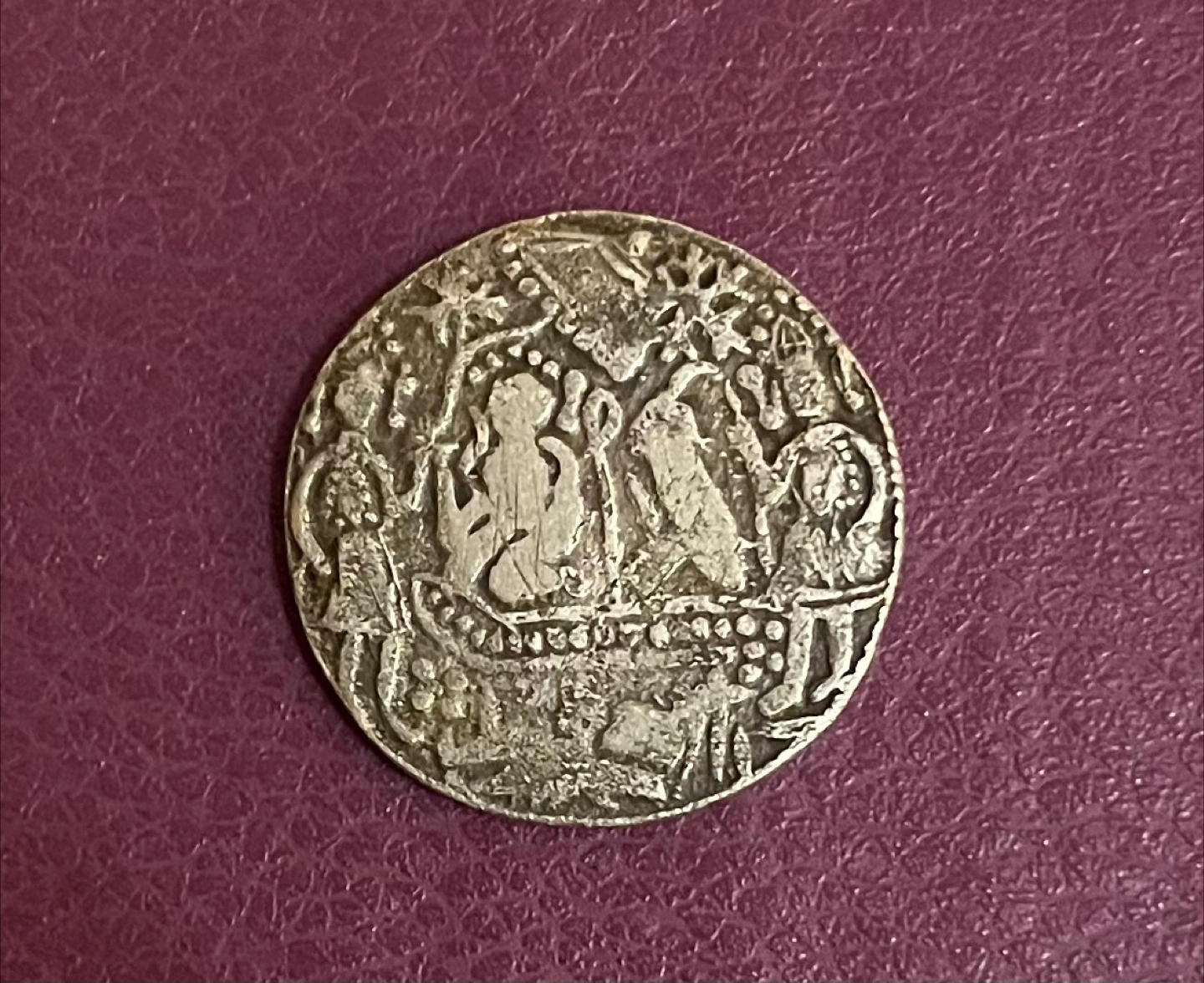 32Here's a Temple Token Ramatanka! It's a spiritual token from India, likely dating between 1850-1928. It's made of silver and weighs about 11.23 grams. The diameter is 21 mm and the shape is round.