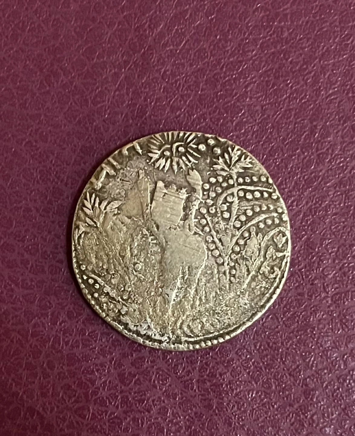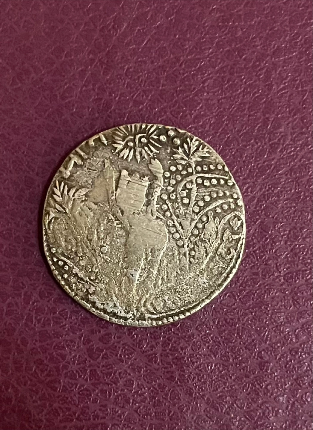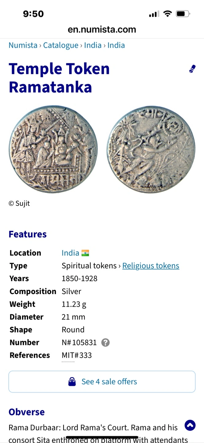 32Here's a Temple Token Ramatanka! It's a spiritual token from India, likely dating between 1850-1928. It's made of silver and weighs about 11.23 grams. The diameter is 21 mm and the shape is round.