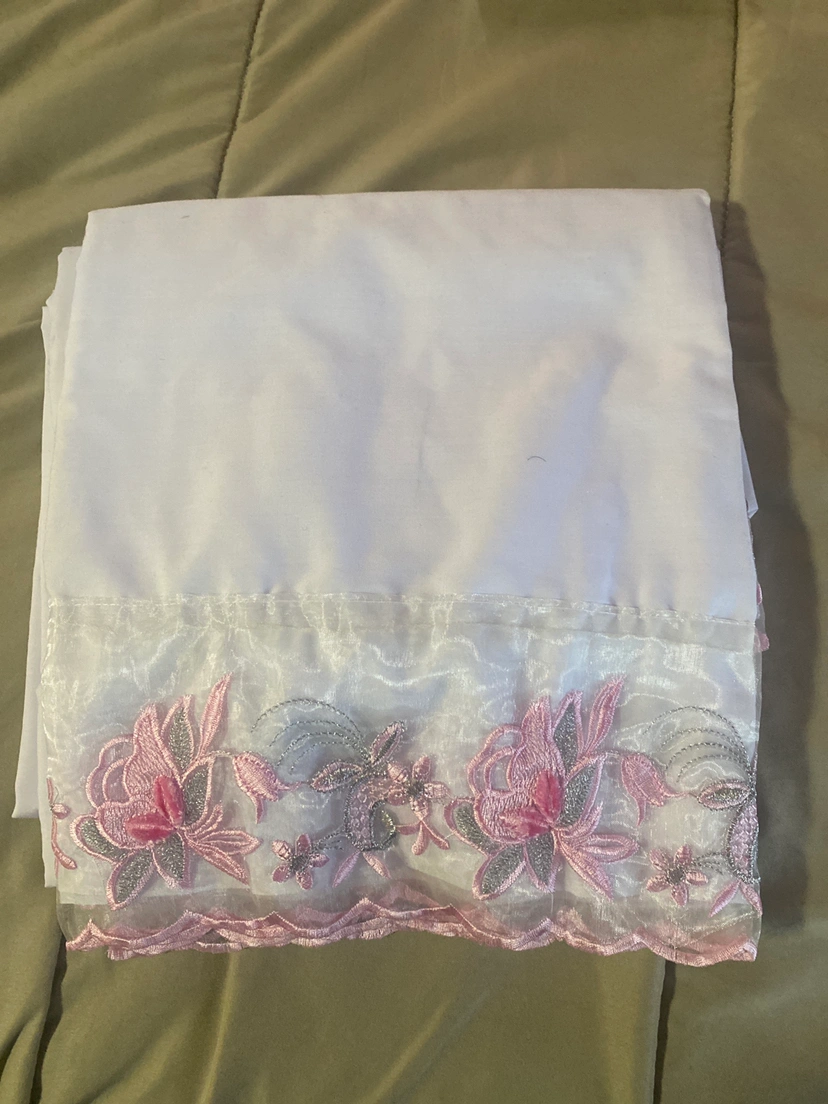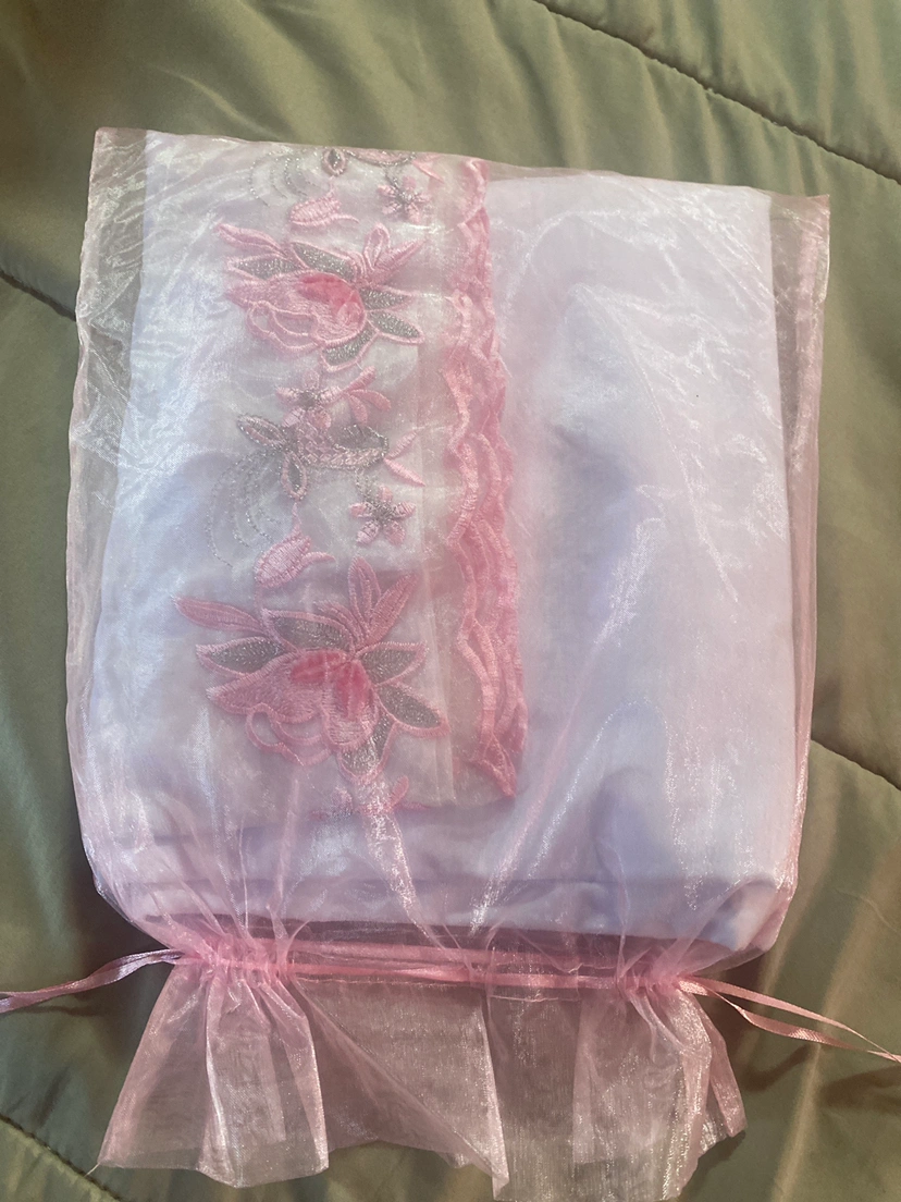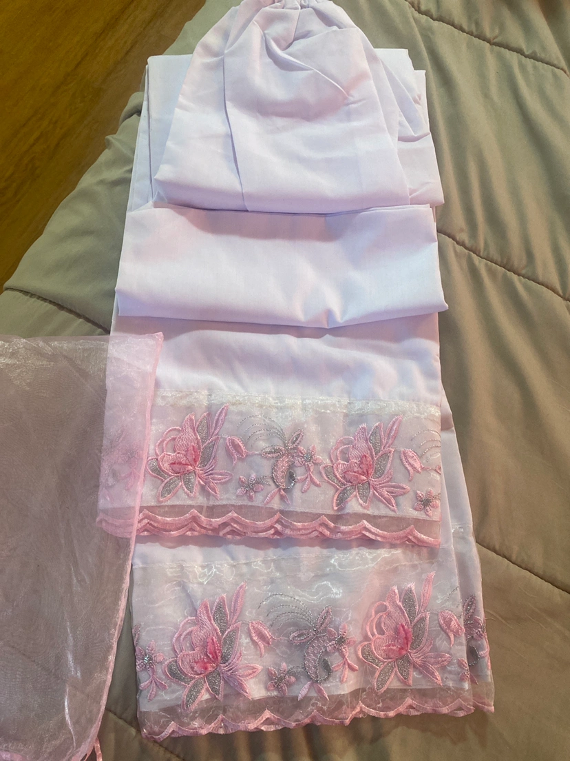 White with nice pink embroidered on the edges of the top and skirt. Having a den-tell pink bag .