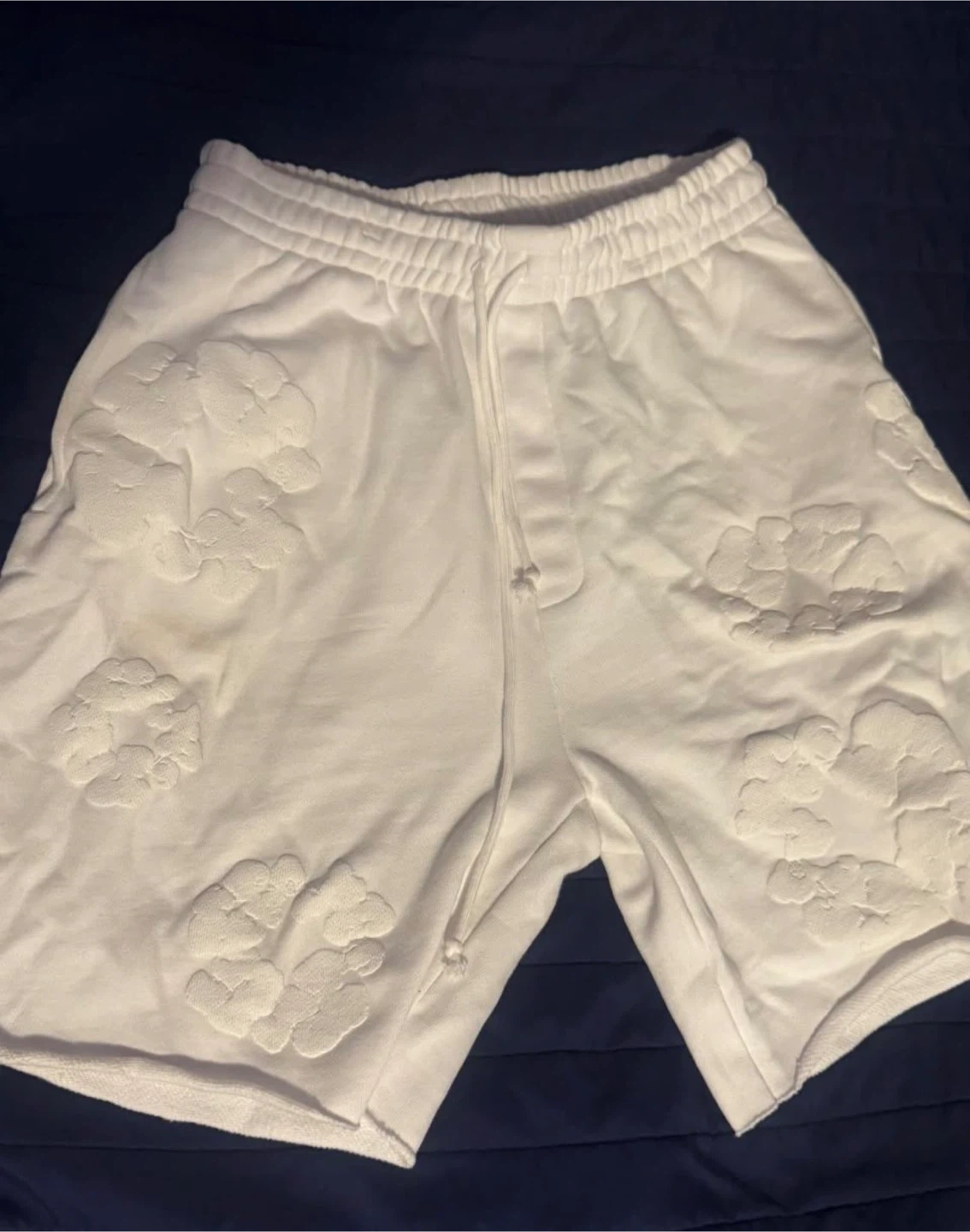 White denim tears shorts with embossed cloud detailing. These shorts feature a drawstring waist and a relaxed fit. Perfect for casual wear.