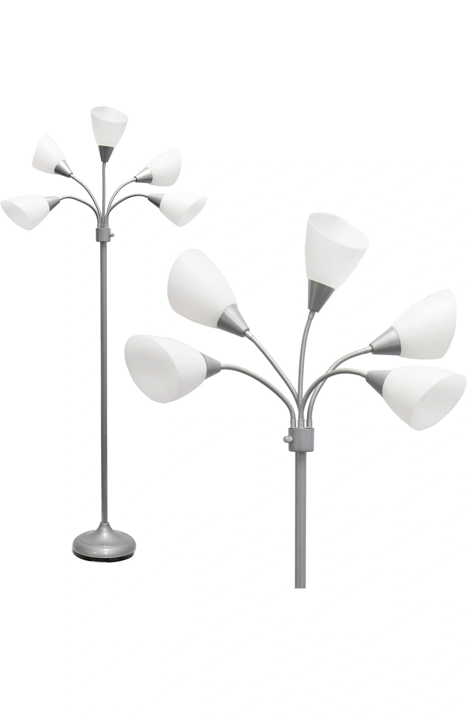 Multi Head Medusa 5 Light Adjustable Gooseneck Silver Floor Lamp with White Shades