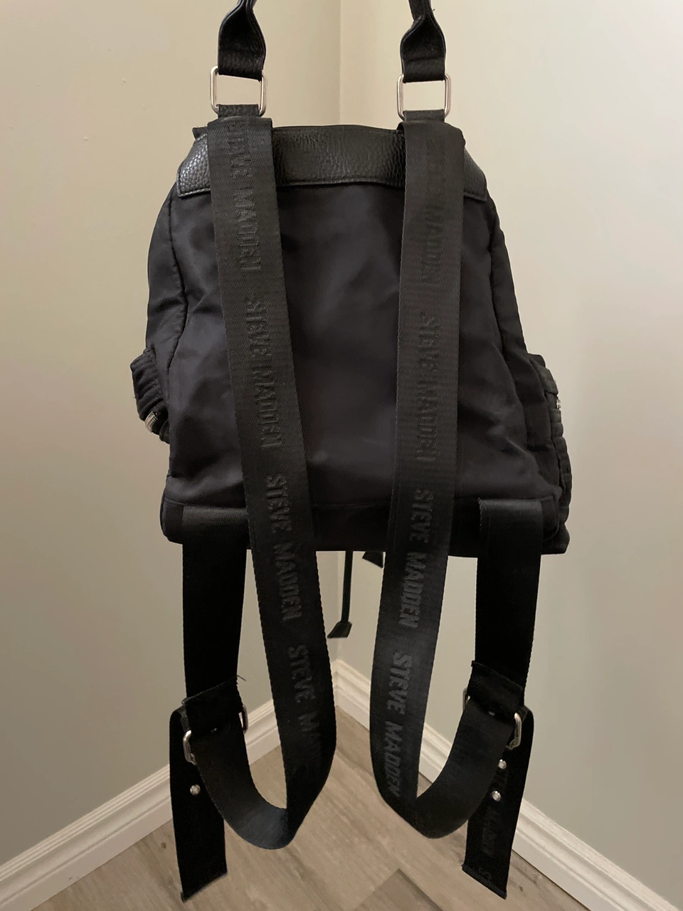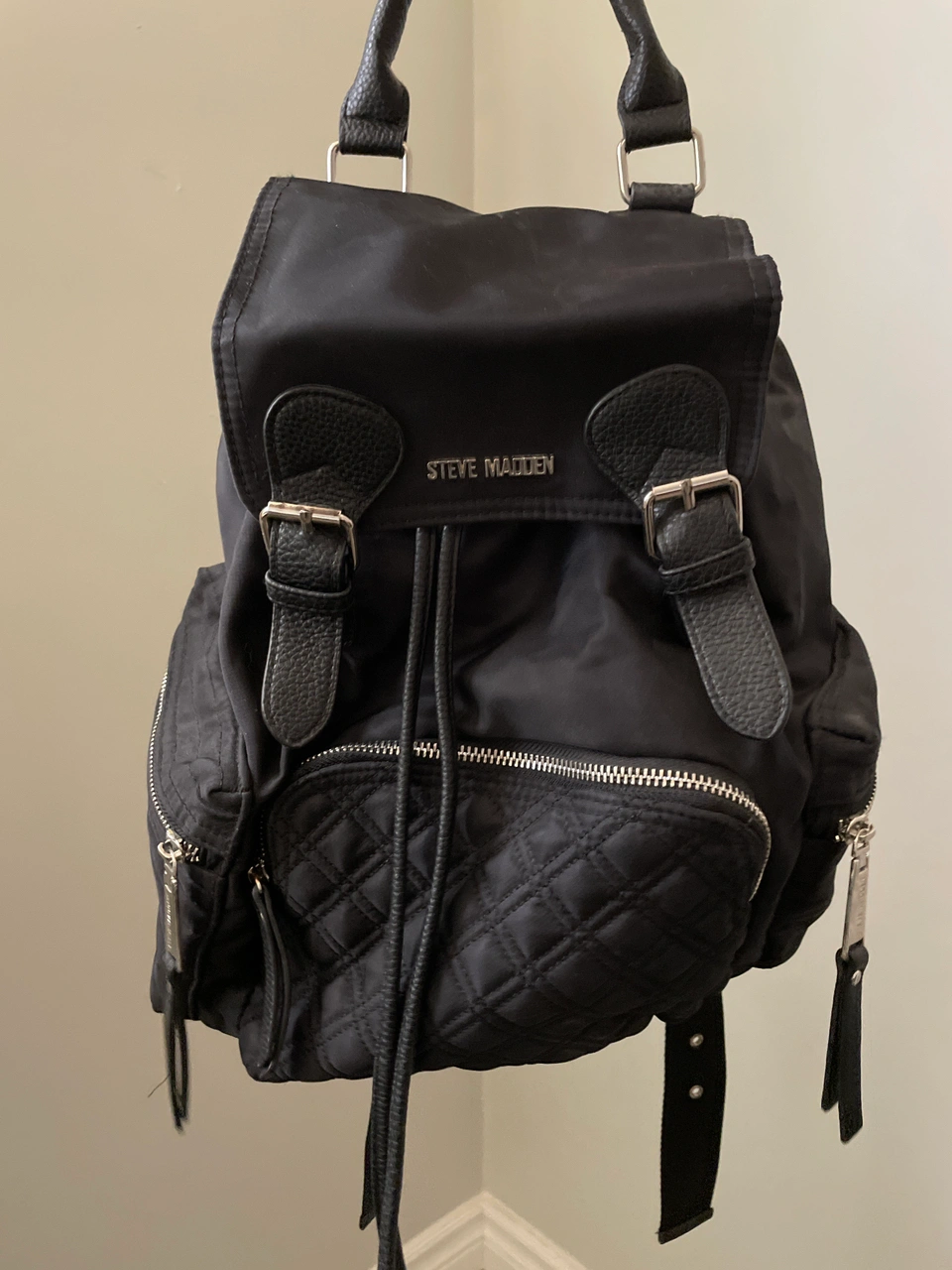 Drawstring Steve Madden backpack. Two side and front zipper pockets. One main opening with a drawstring.
