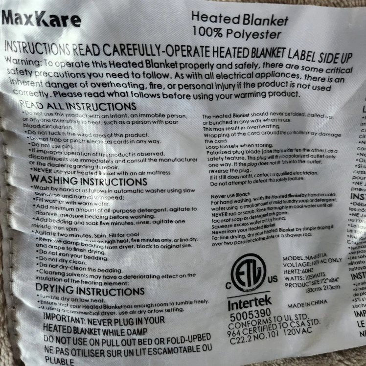 Link (same model but under a different brand name): Comfier Electric Blanket Full Size 72" x 84", Heated Blanket Soft Silky Plush &Fast Heating Blanket Throw,Washable & Adjustable Heat Levels, Auto Shut Off,Lightweight,Gray https://a.co/d/bEl9MOa