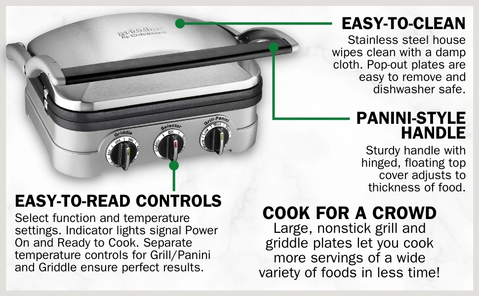 - Contact grill, panini press, flat grill and griddle with removable, nonstick grill and griddle plates (reversible)