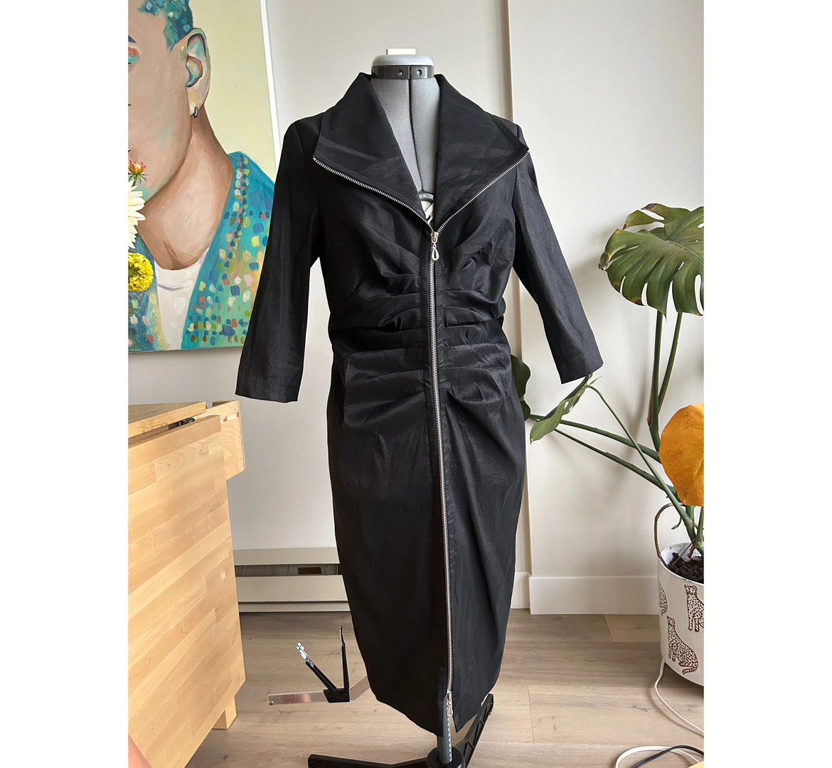 This well constructed, beautiful black zipper dress could be worn in the office or to dinner. The front and back has beautiful detailing and the sleeve cuffs can be folded for a different look.