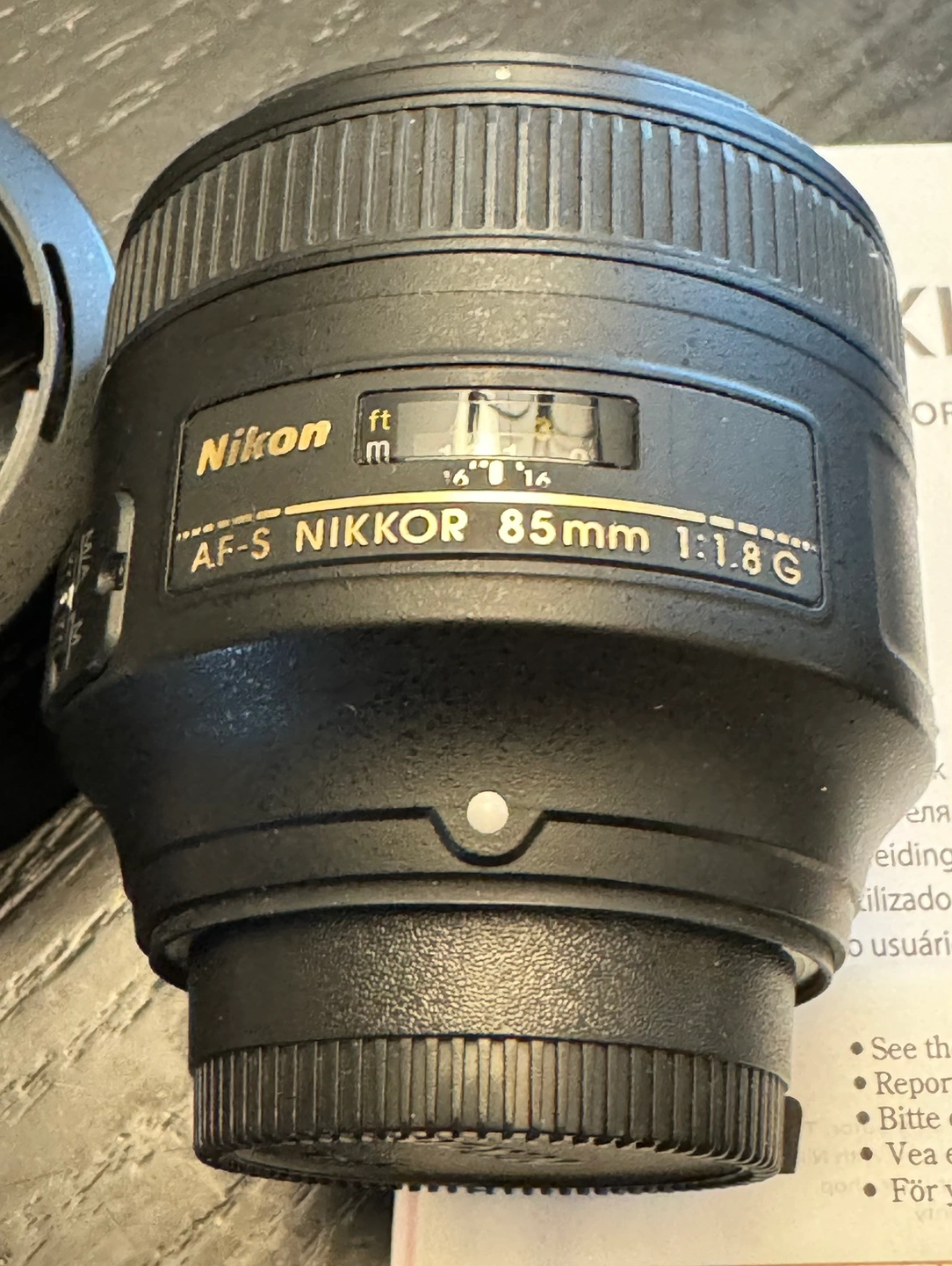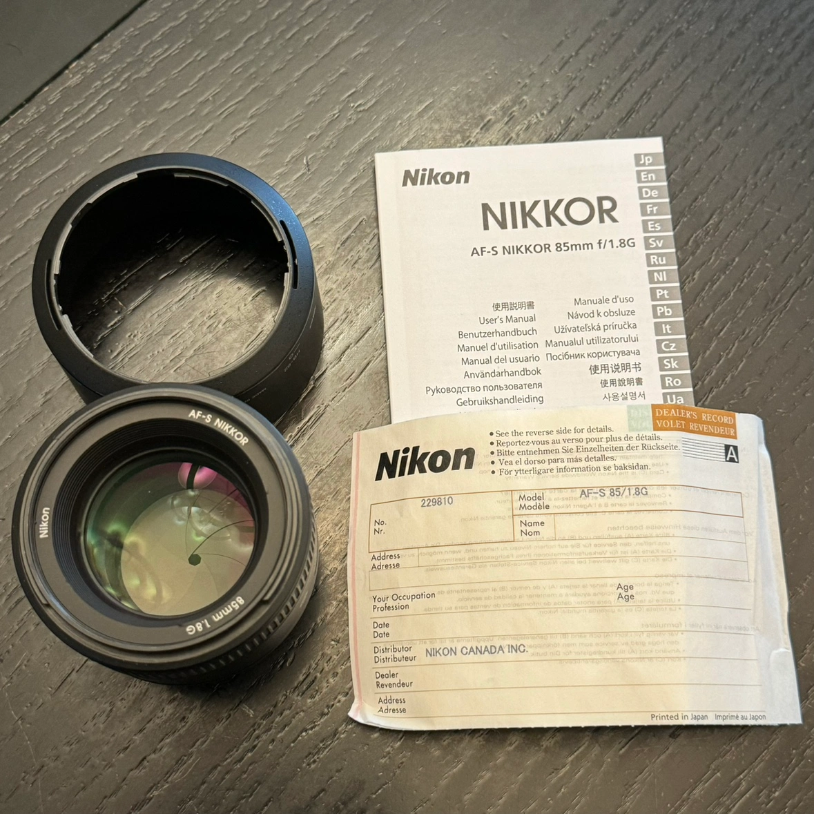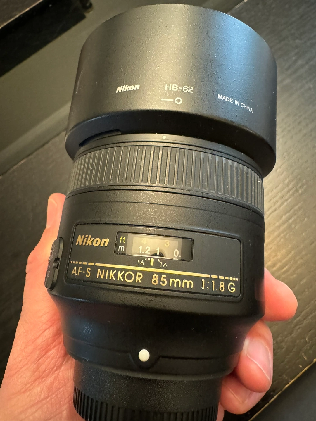 Offering for sale a Nikon 85mm 1.8G AFS FX full frame lens. I’m the original owner. The lens is in like new condition. Comes with: - Lens caps - Lens hood - Original box - Lens manual and paperwork Lens is in excellent condition. Great for portraits with a Nikon F mount DSLR body or some later era Nikon film cameras (e.g. F65 - F100 film bodies). Asking $375. No lowballers please.