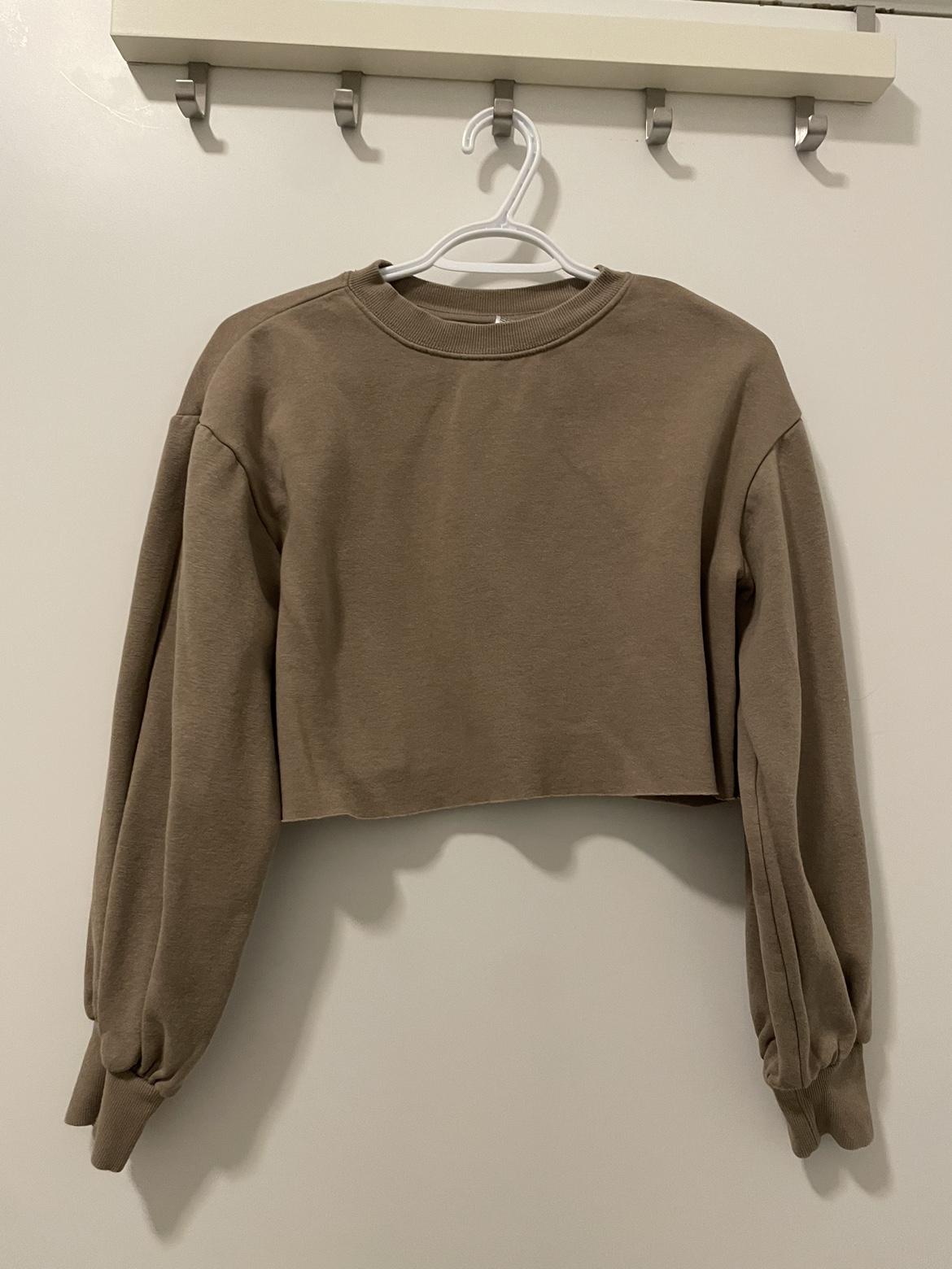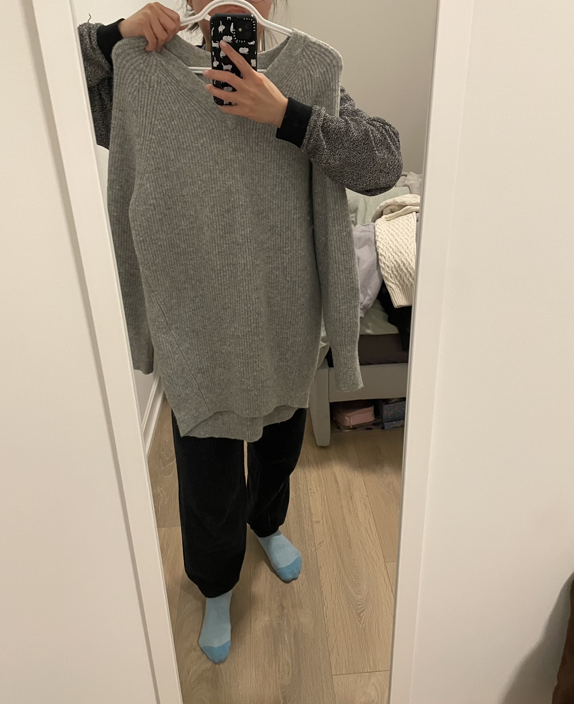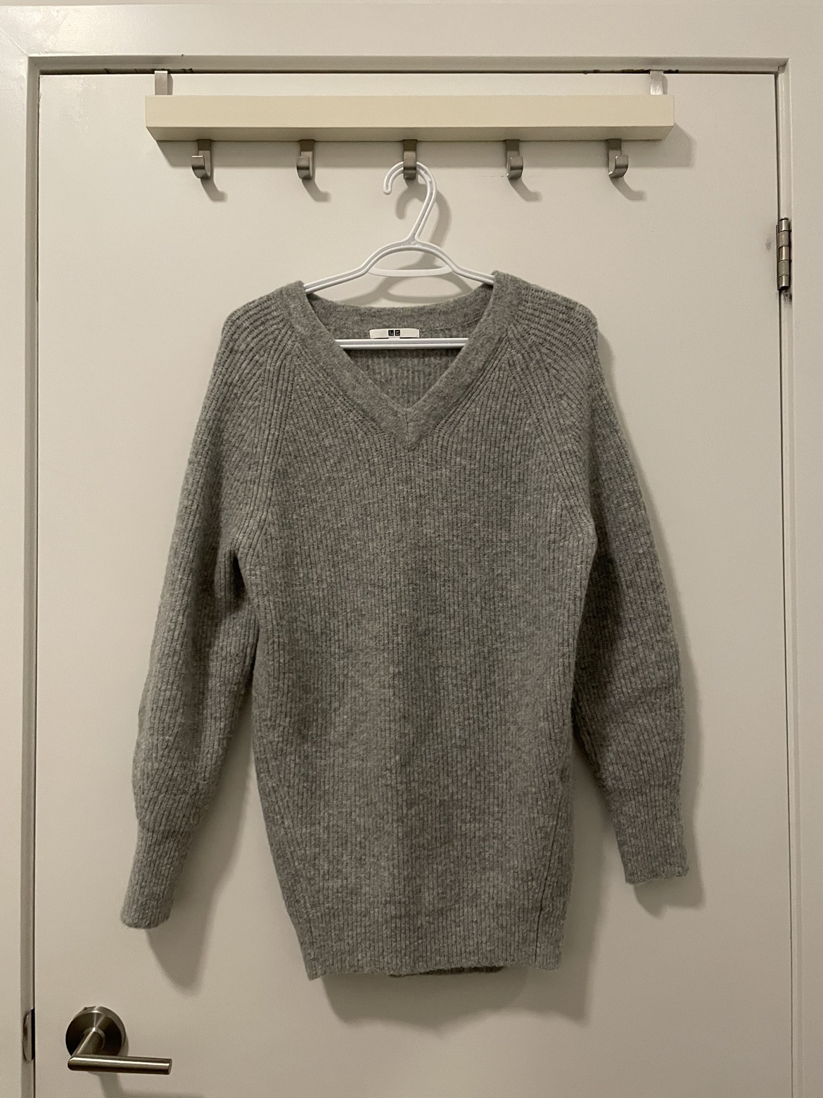 419Can do $10 for both items! Items are described in order of photos 1) grey v-neck Uniqlo sweater in XS (second photo shows approximately how long, I’m 5’1 for reference) -will hit around thigh area - $10 2) H&M tan/beige cropped crew neck in XS - $5