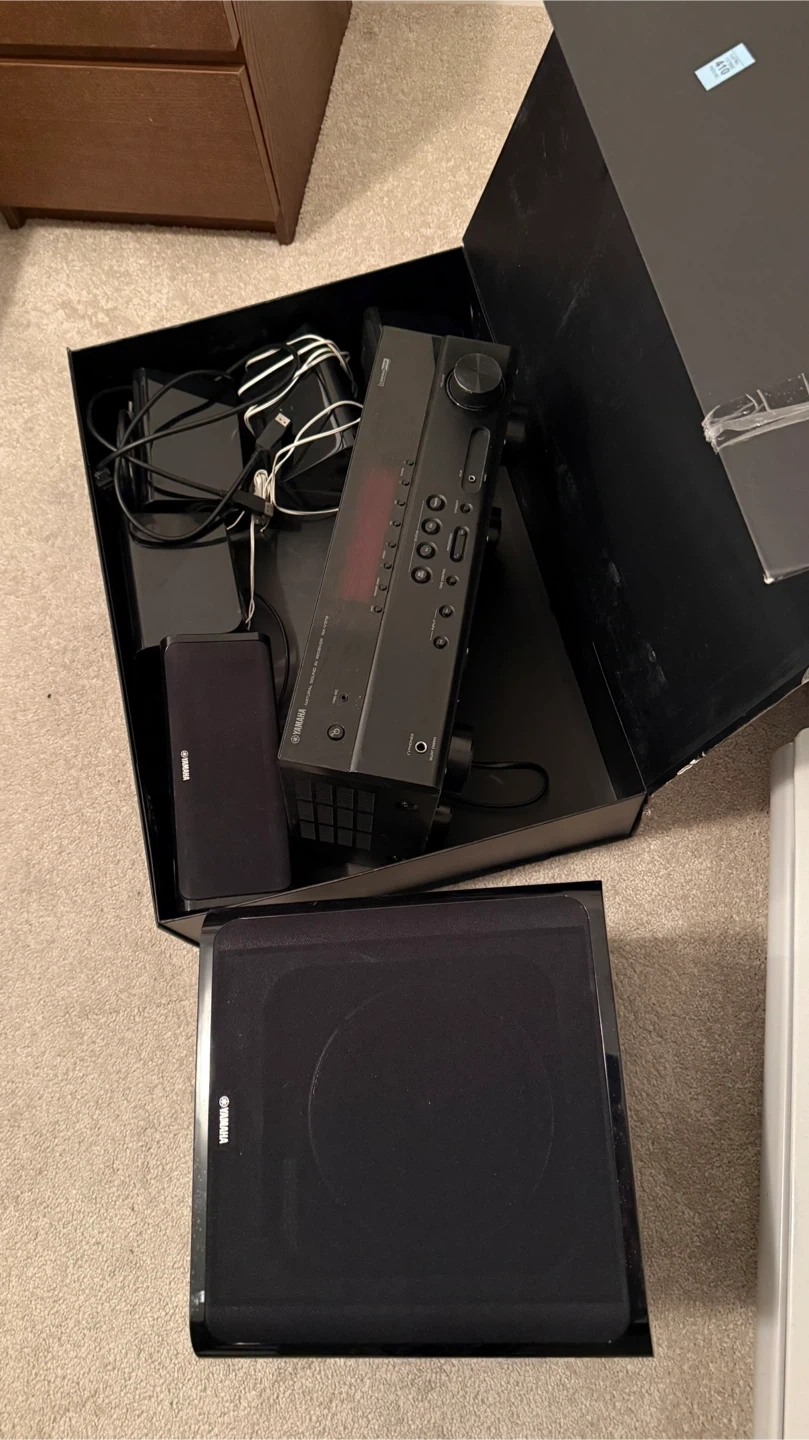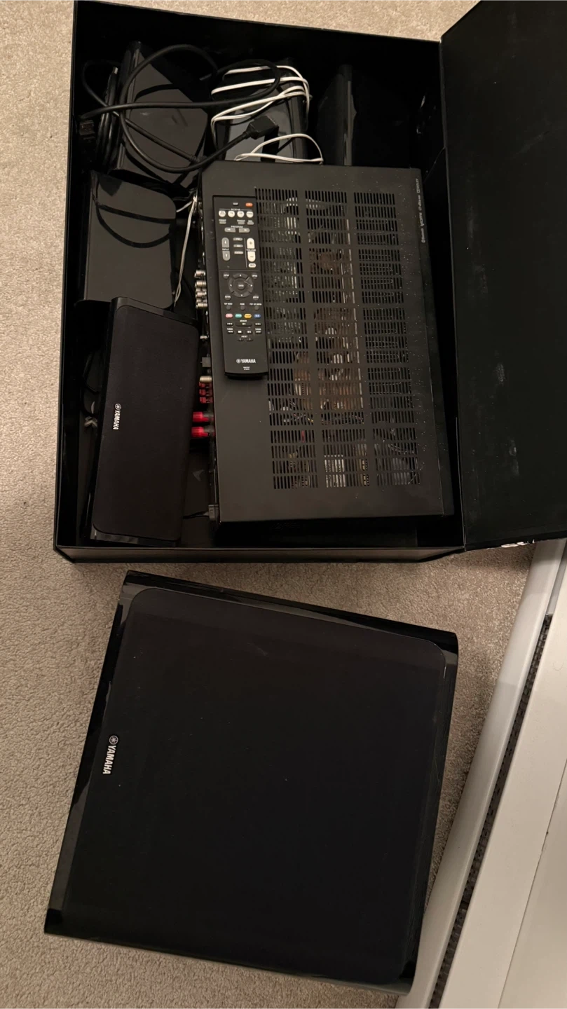 Selling a Yamaha home theatre system, complete with a receiver, speakers, and subwoofer. It comes with its original box and remote control. Perfect for setting up a great sound system in your home!