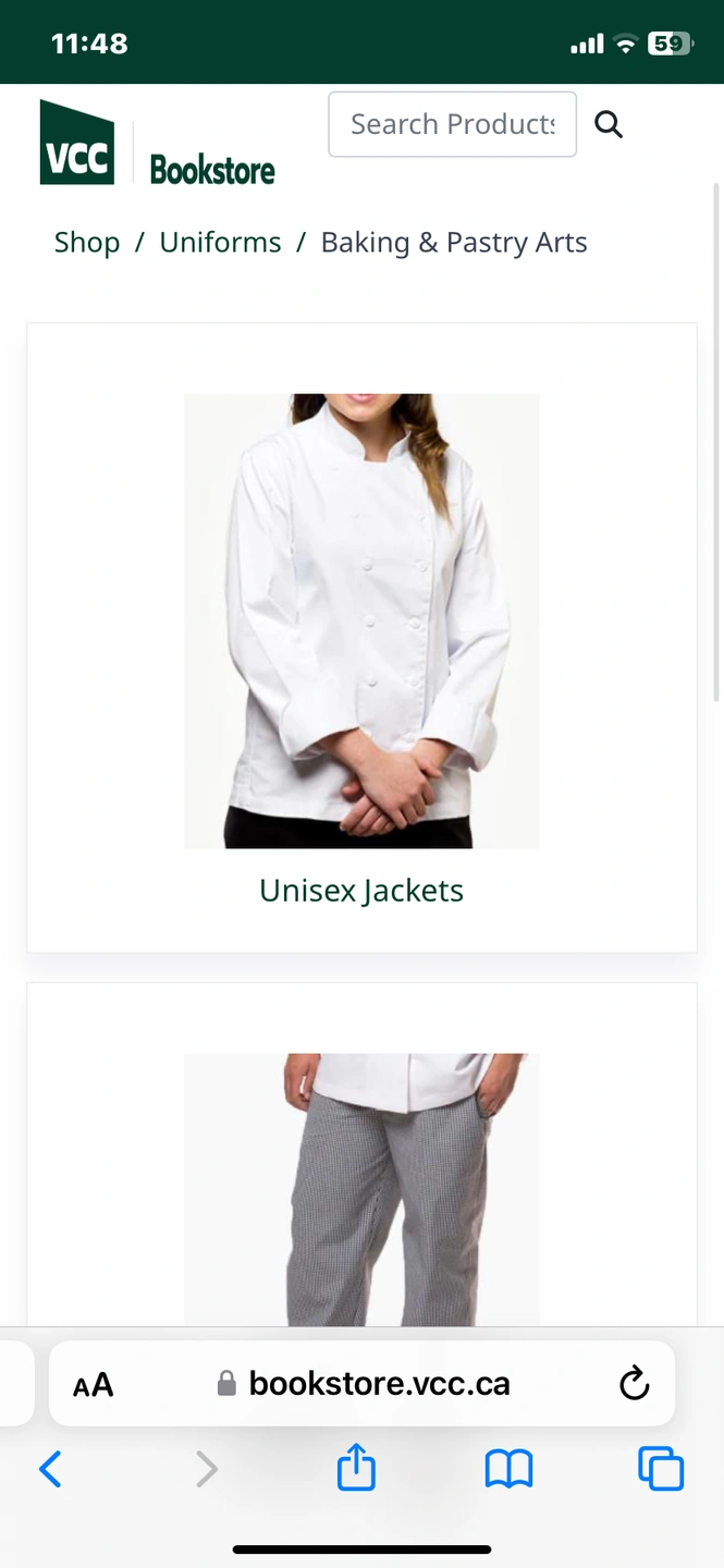 VCC Culinary and Baking Uniforms. Please read descriptions