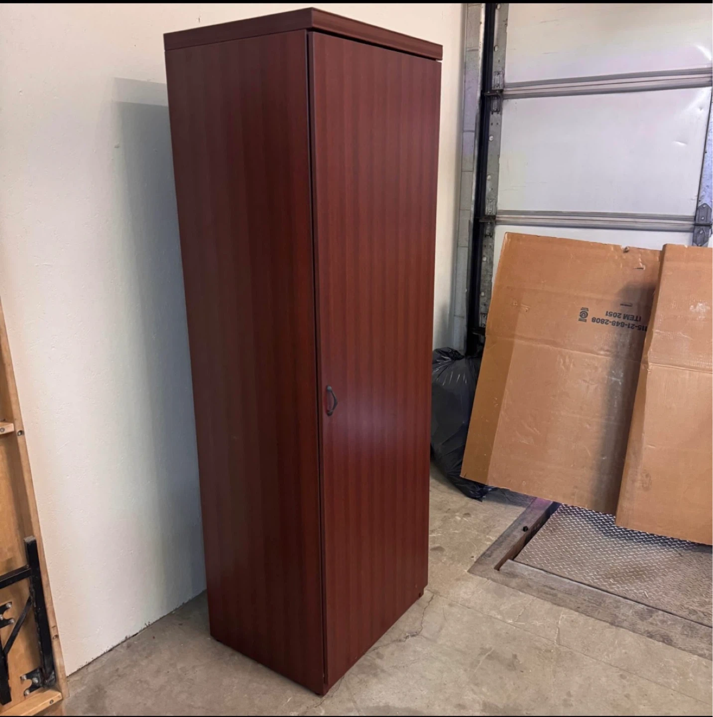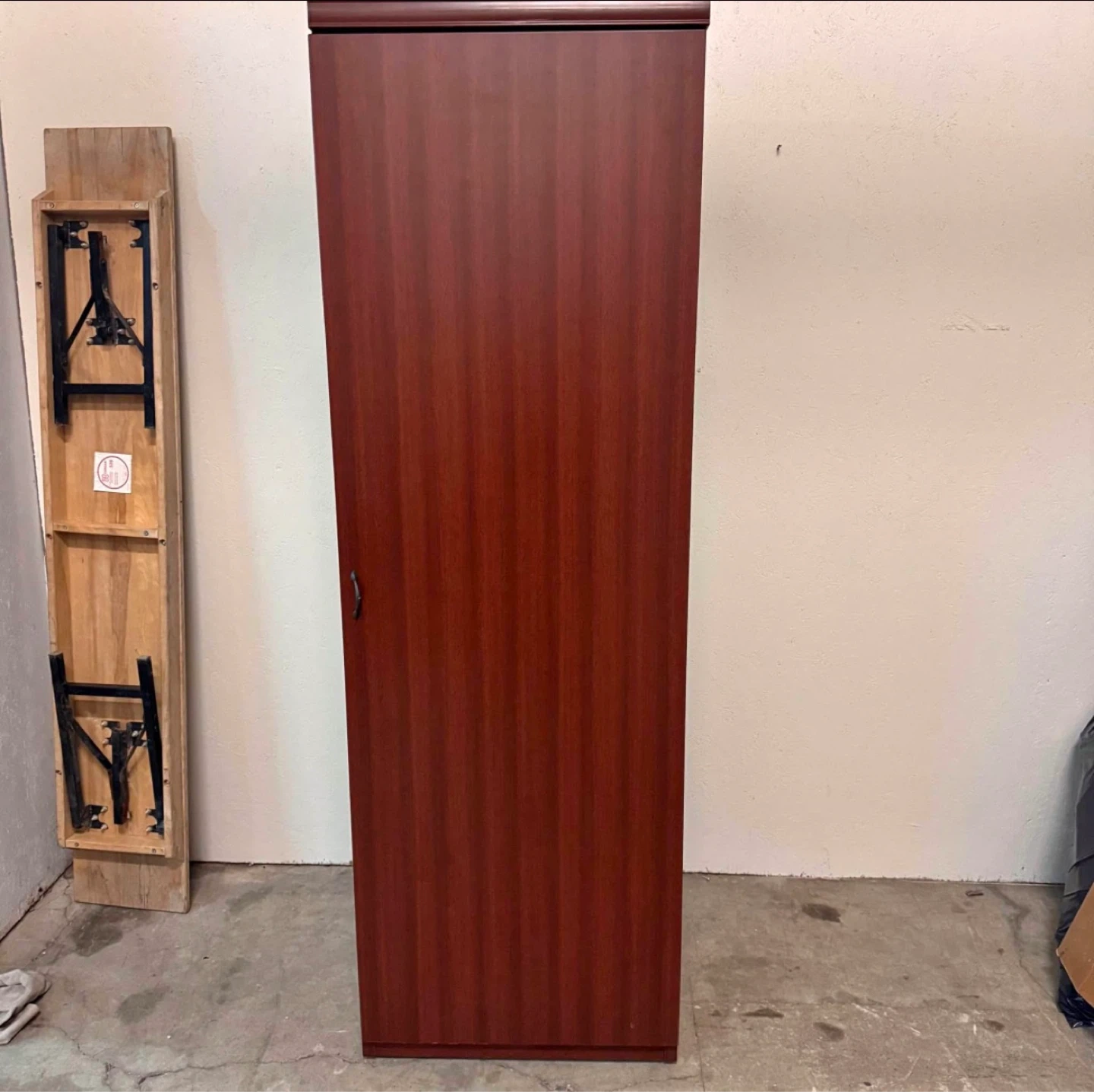 Sturdy and stylish storage cabinet in great condition, perfect for office or home use. Made with high-quality materials and finished in a rich wood tone. Features three adjustable shelves and a hanging rod for coats or uniforms.