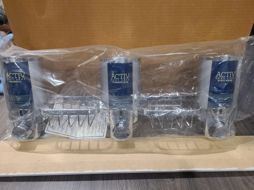 handy dispenser for shower that will hold your body wash , shampoo and conditioner plus 2 wire racks also included are instructions for installation and a small tube of silicone. I have 2 units. these are brand new. great for air b&b or the cottage!!!
