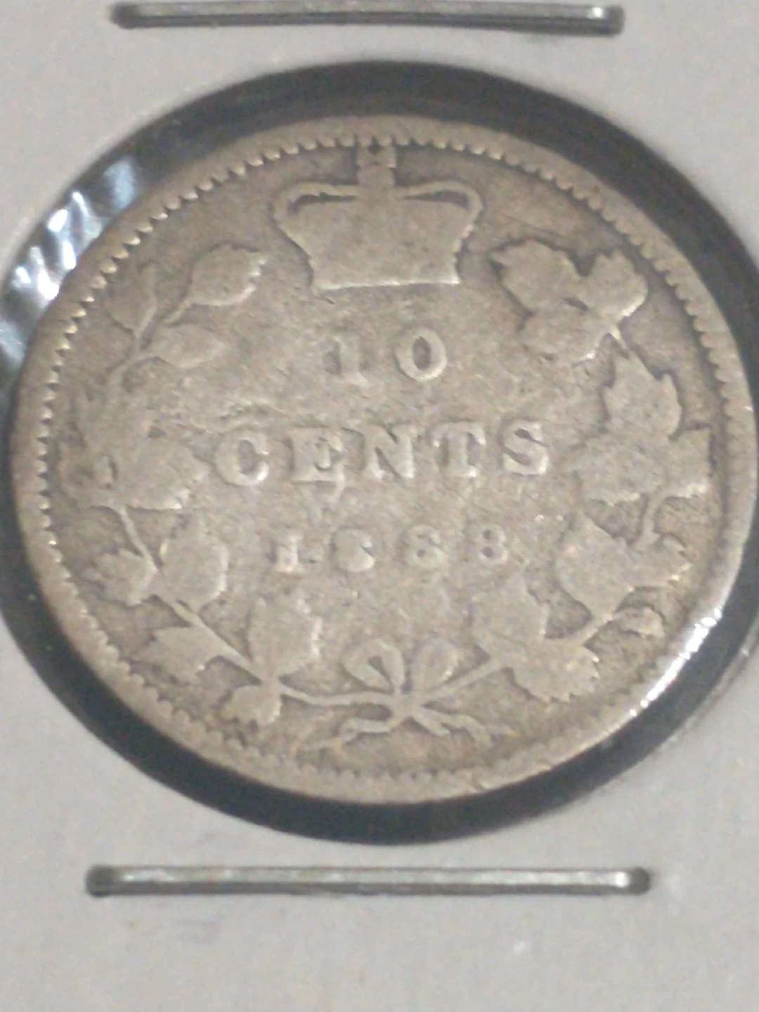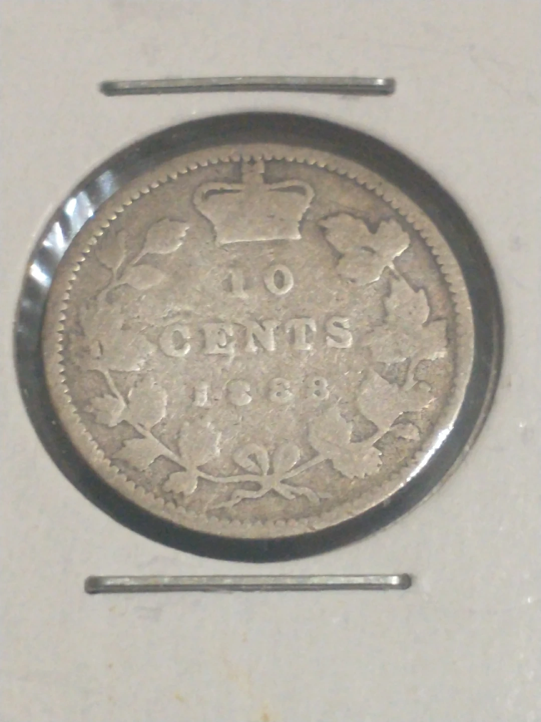 190Selling a Canadian 10 cents coin from 1888. It features Victoria Dei Gratia Regina on one side and the words '10 CENTS 1888' surrounded by maple leaves on the other