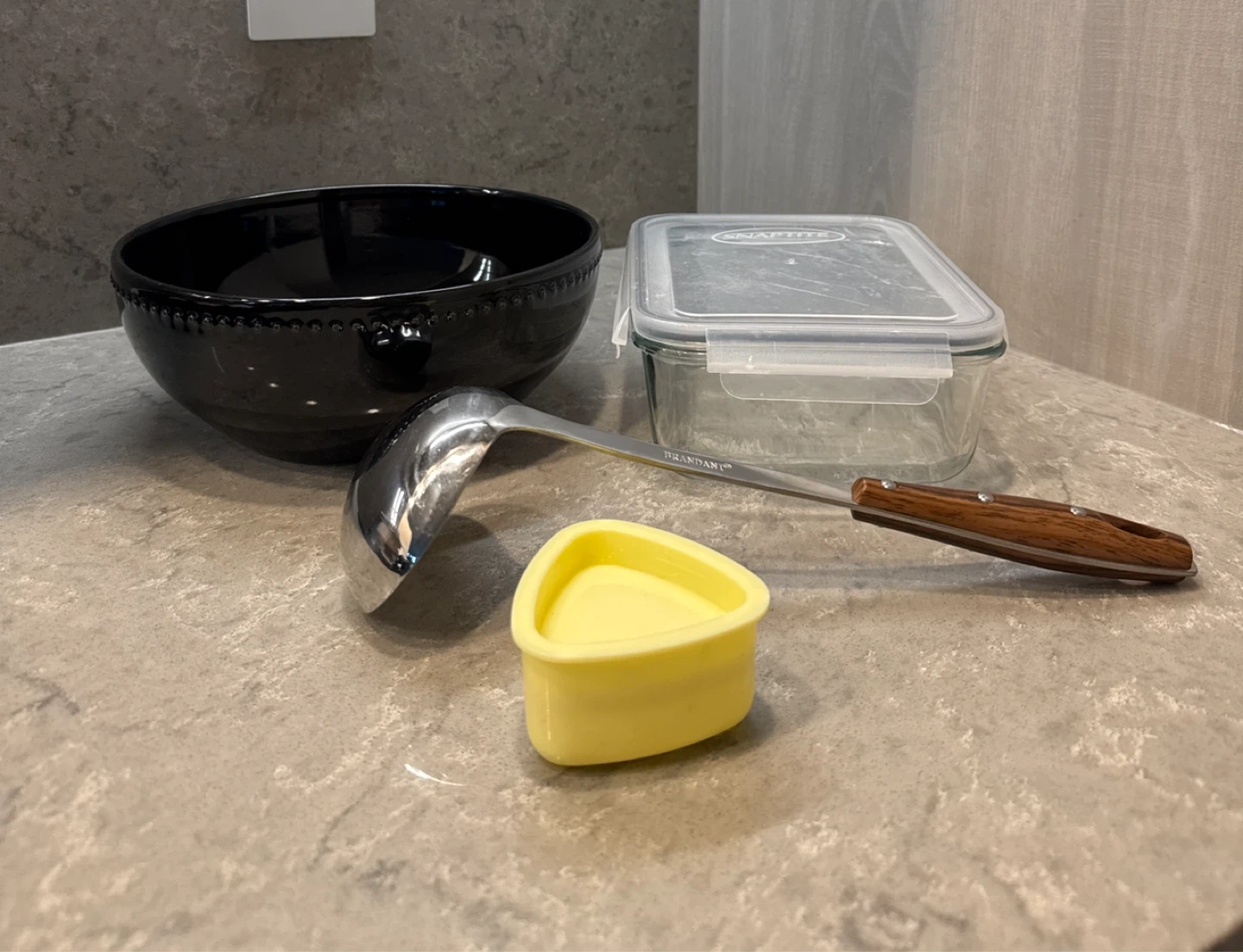 Includes a black serving bowl with a decorative edge and a stainless steel ladle with a wooden handle. Also comes with a small yellow butter dish and a rectangular Snap-Tight glass food storage container. Great for serving or storing meals!
