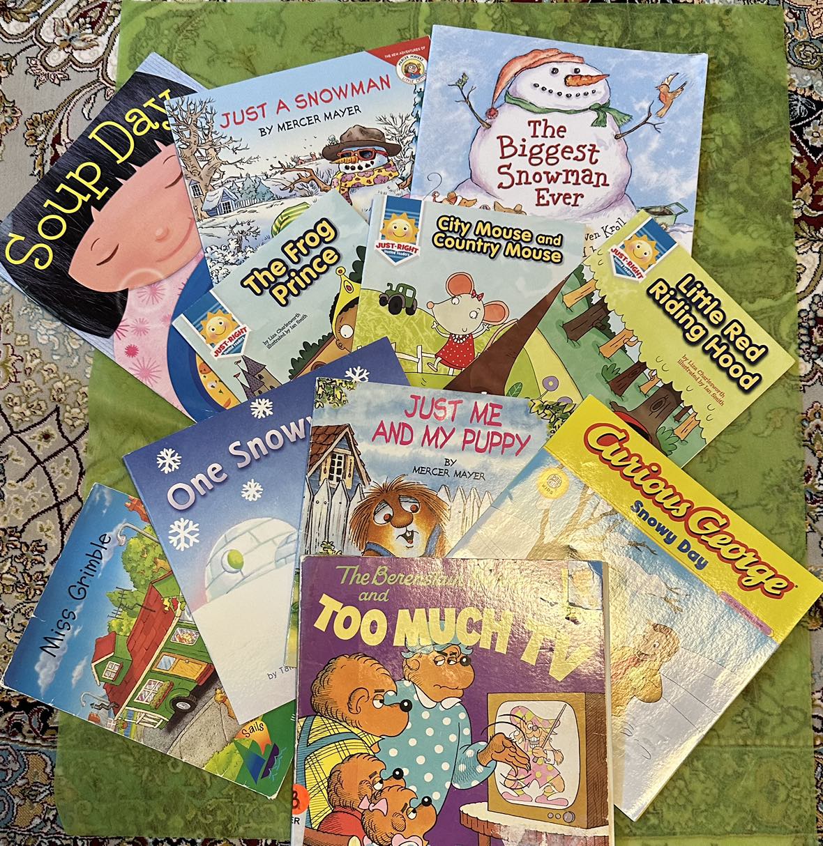 48611 kids book: 1-too much TV 2- Miss Grimble 3- one snowy Day 4- Just me and my puppy 5- Curious George Snowy Day 6- The Frog Prince 7- City Mouse and Country Mouse 8- Soup Day 9- Just a snowman 10- The Biggest Snowman Ever 11- Little Red Riding Hood