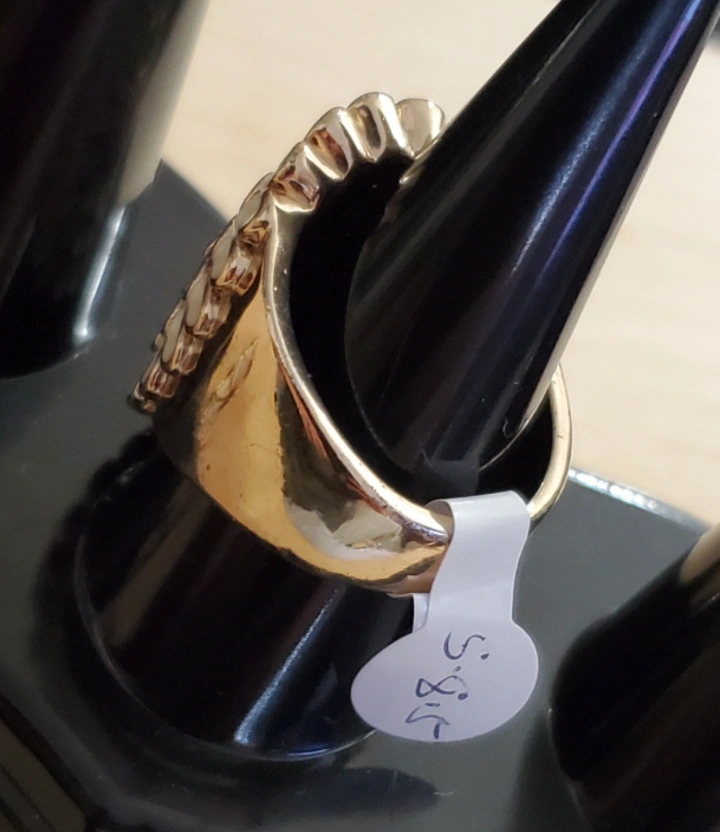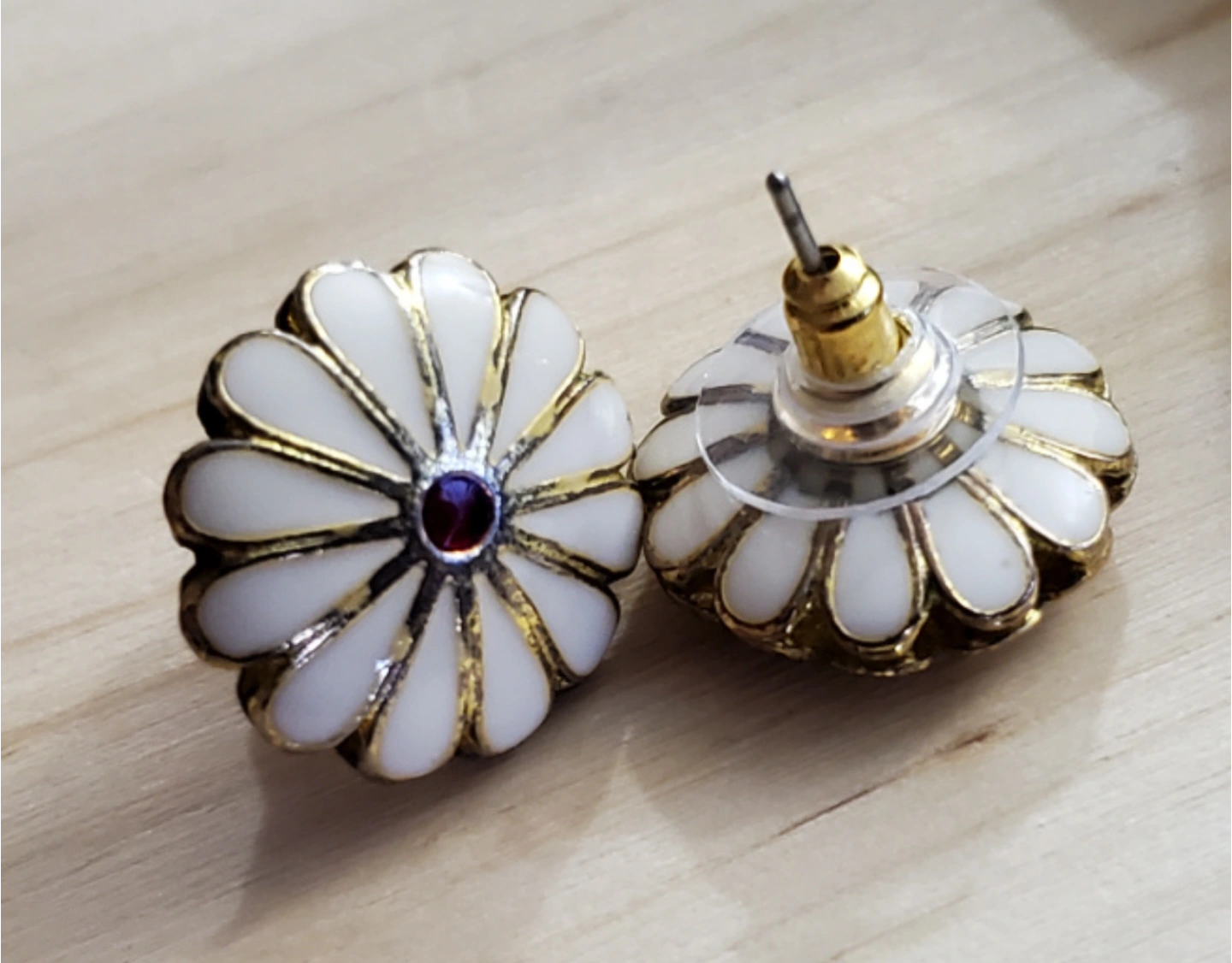 Set includes a ring and two earrings, all with a white enamel daisy design and gold trim.