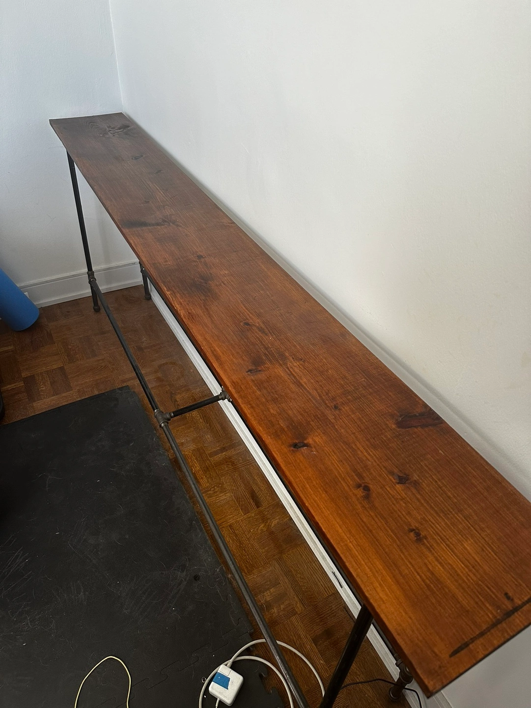 Similar style to restoration hardware. Legs are made of black steel and top is stained pine. Could easily be sanded and repainted or stained.