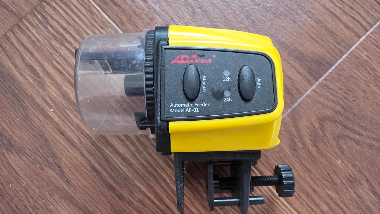 This automatic fish feeder from ADA is the AF-01 model. It offers manual and auto feeding modes, with options for 12-hour or 24-hour intervals. It's a handy device for keeping your fish fed when you're away.