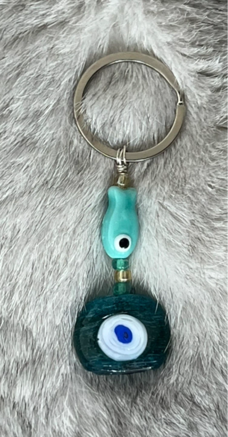 This handmade keychain features a turquoise evil eye charm and a blue evil eye bead. Beads are glass with metal hardware. It's a lovely accessory for your keys!