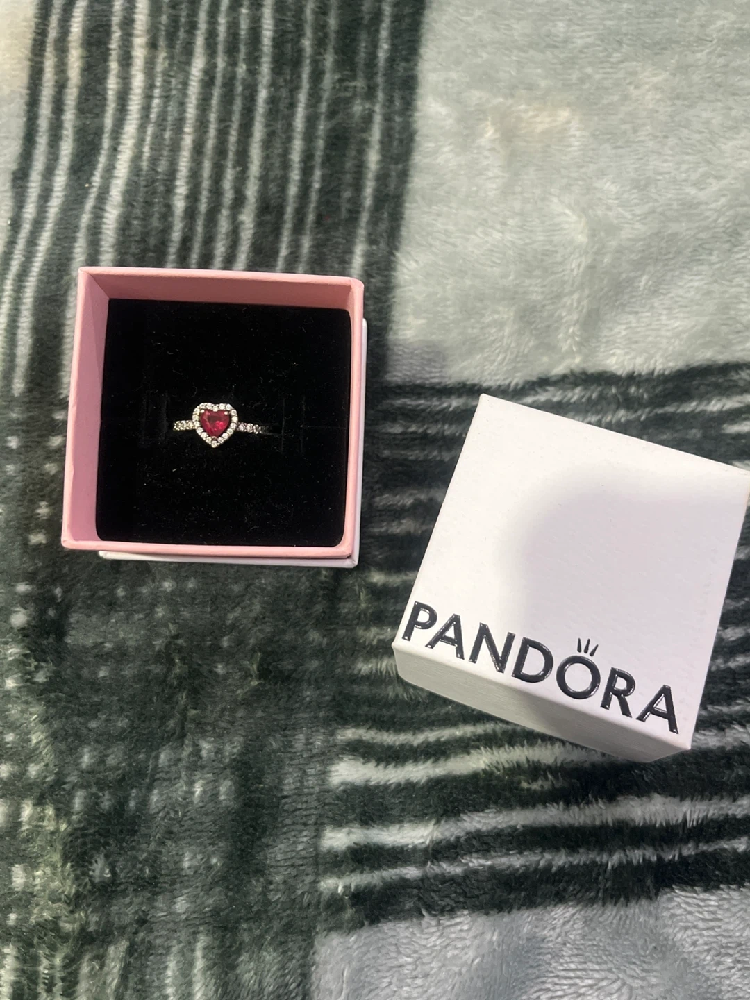 This Pandora ring features a red heart-shaped stone surrounded by clear accent stones. It comes with its original Pandora box.