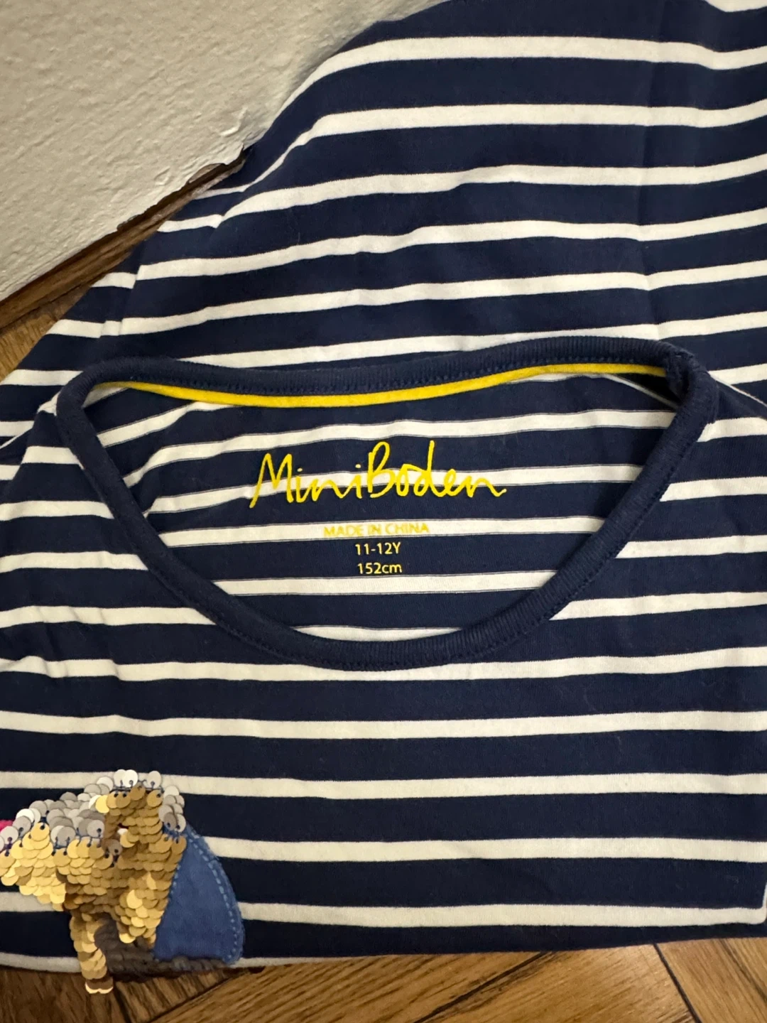 Mini Boden Navy Striped Dachshund Sequin T-Shirt Size 11-12Y