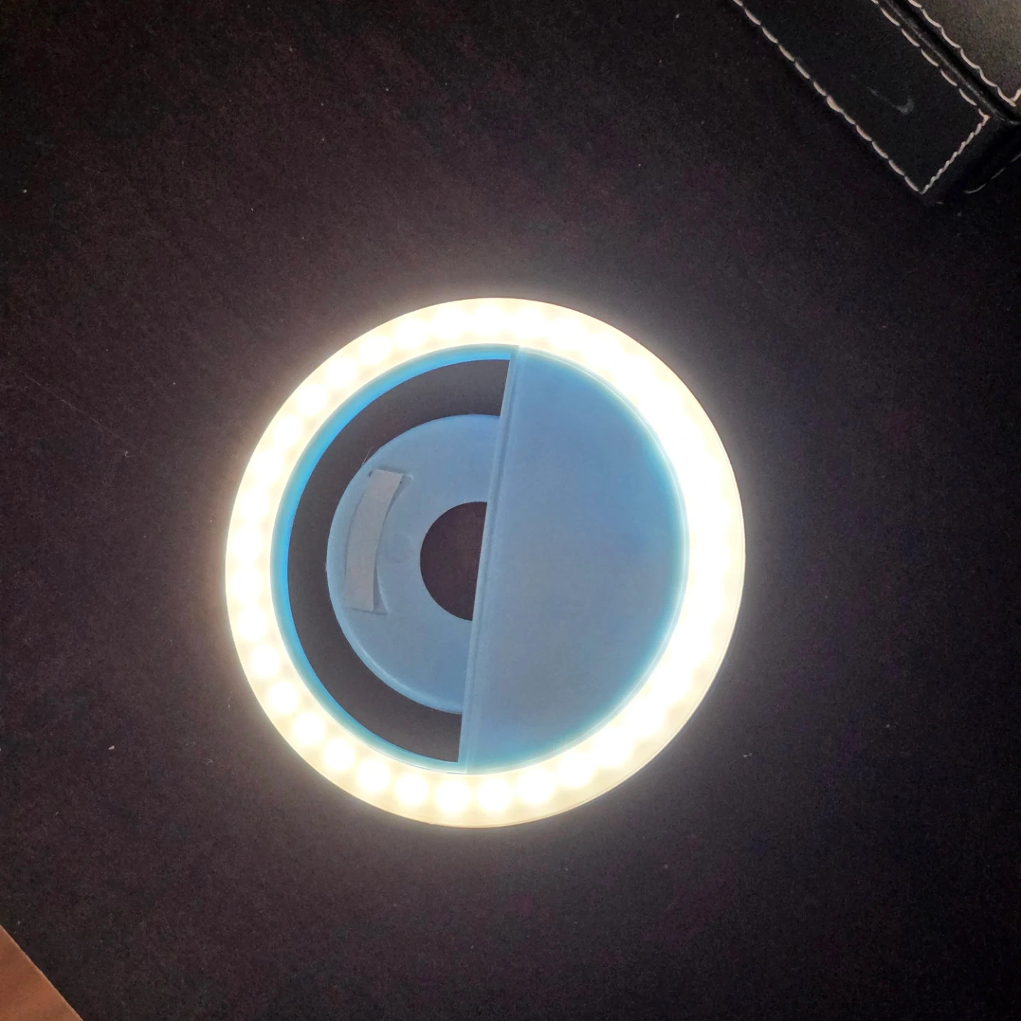 This is a selfie ring light. It clips onto your phone for better lighting. The ring light has LED bulbs that provide bright illumination. It's perfect for taking selfies or videos in low light conditions!