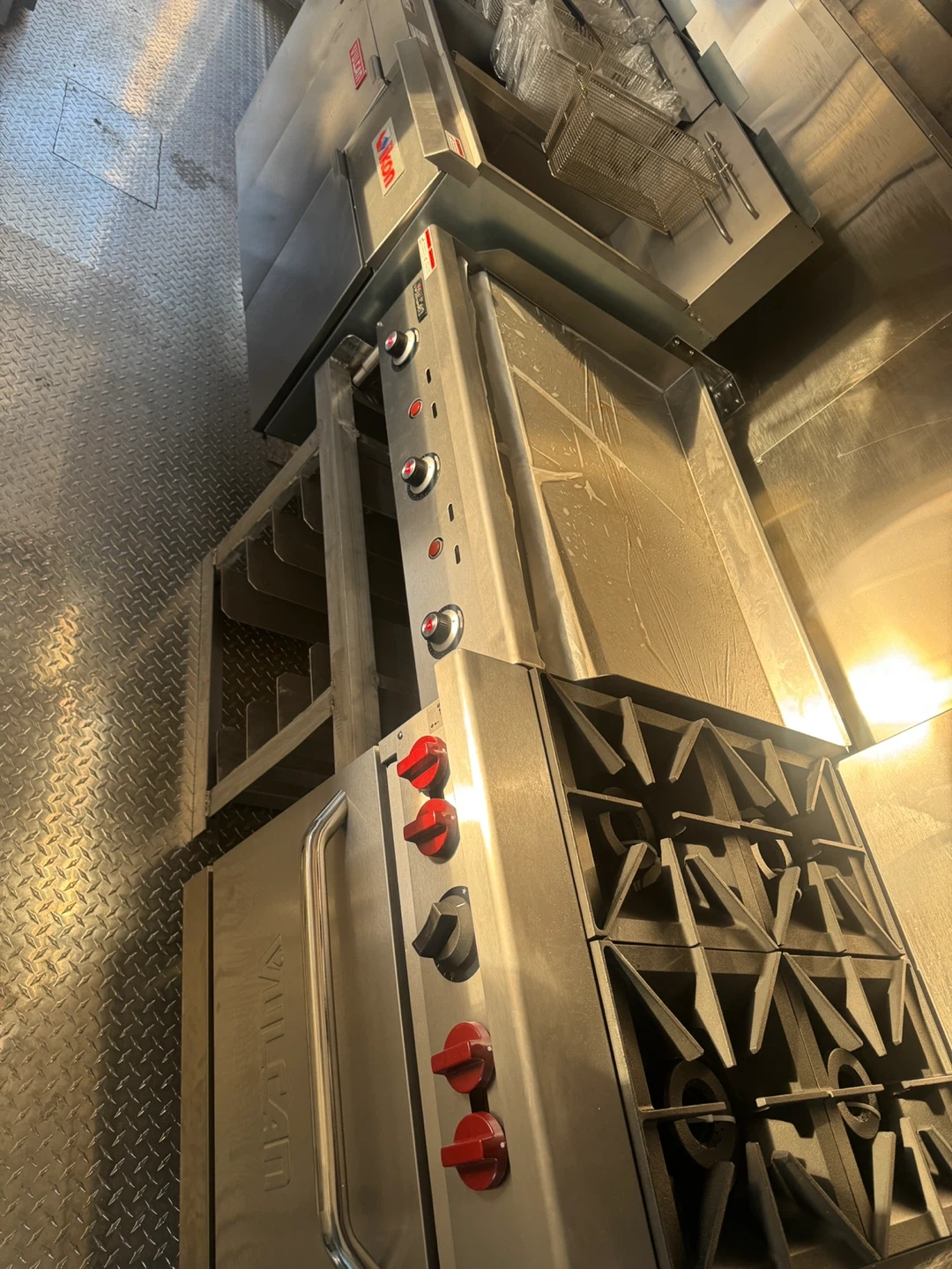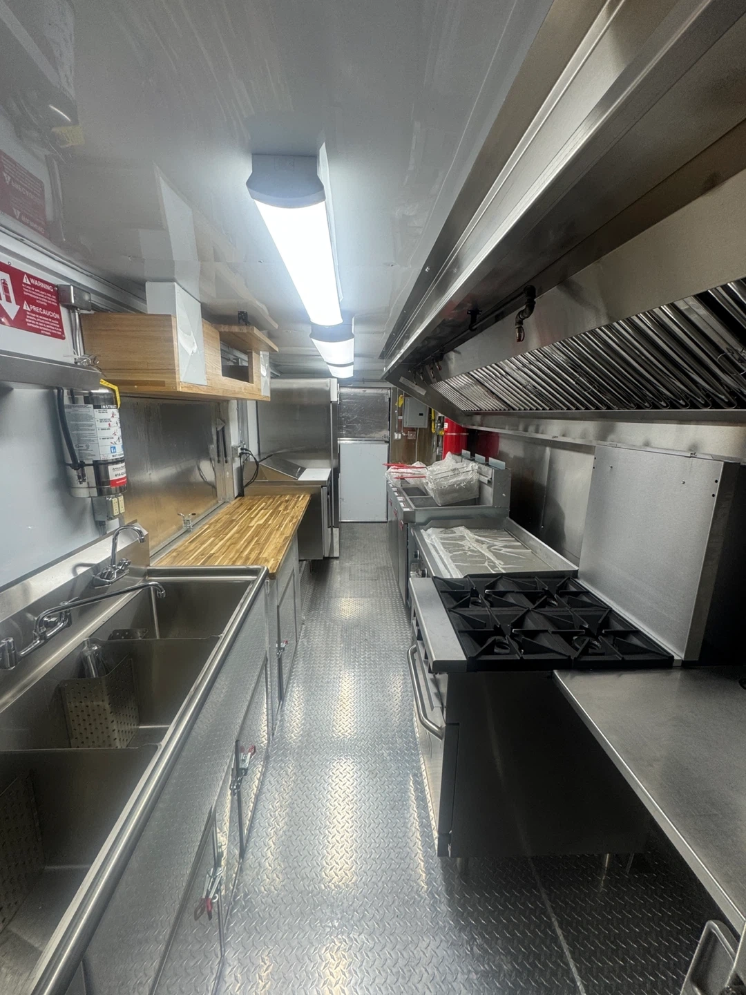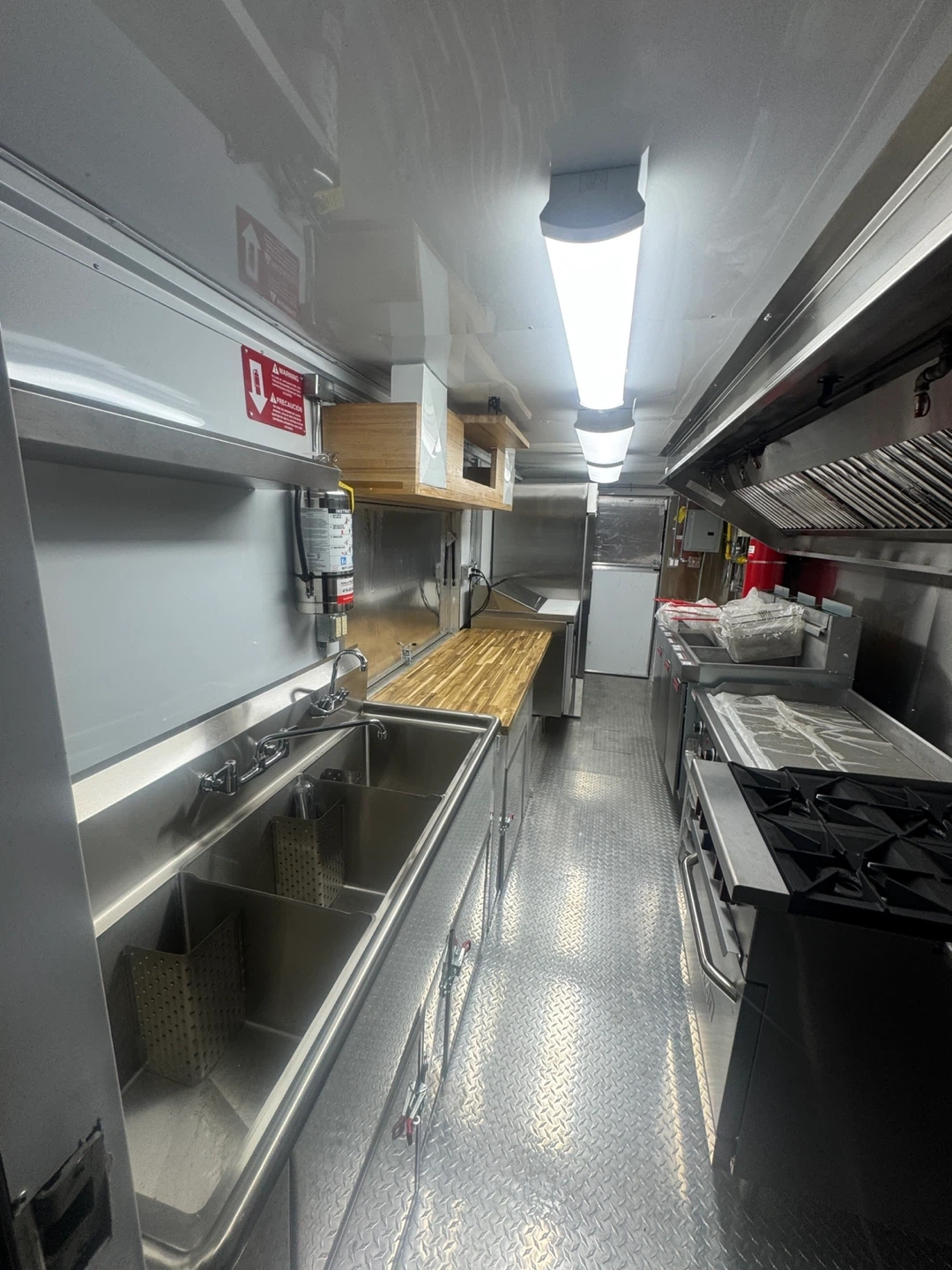 Fully equipped commercial food truck interior with stainless steel surfaces. Features include a multi-compartment sink, stovetop burners, and a griddle. This setup is ready for a mobile food business. Plenty of counter space and storage.
