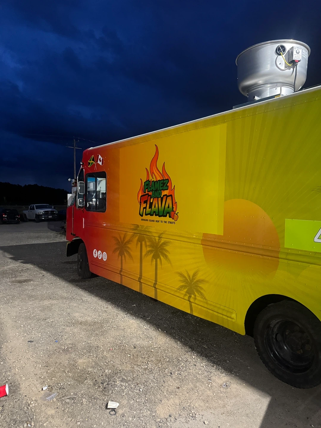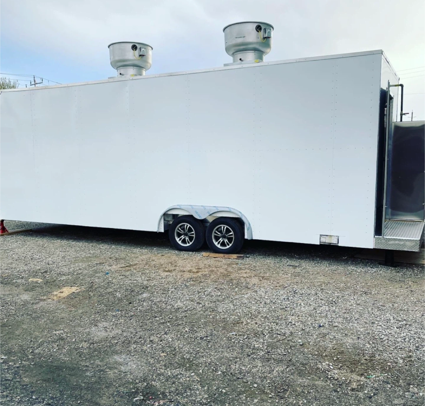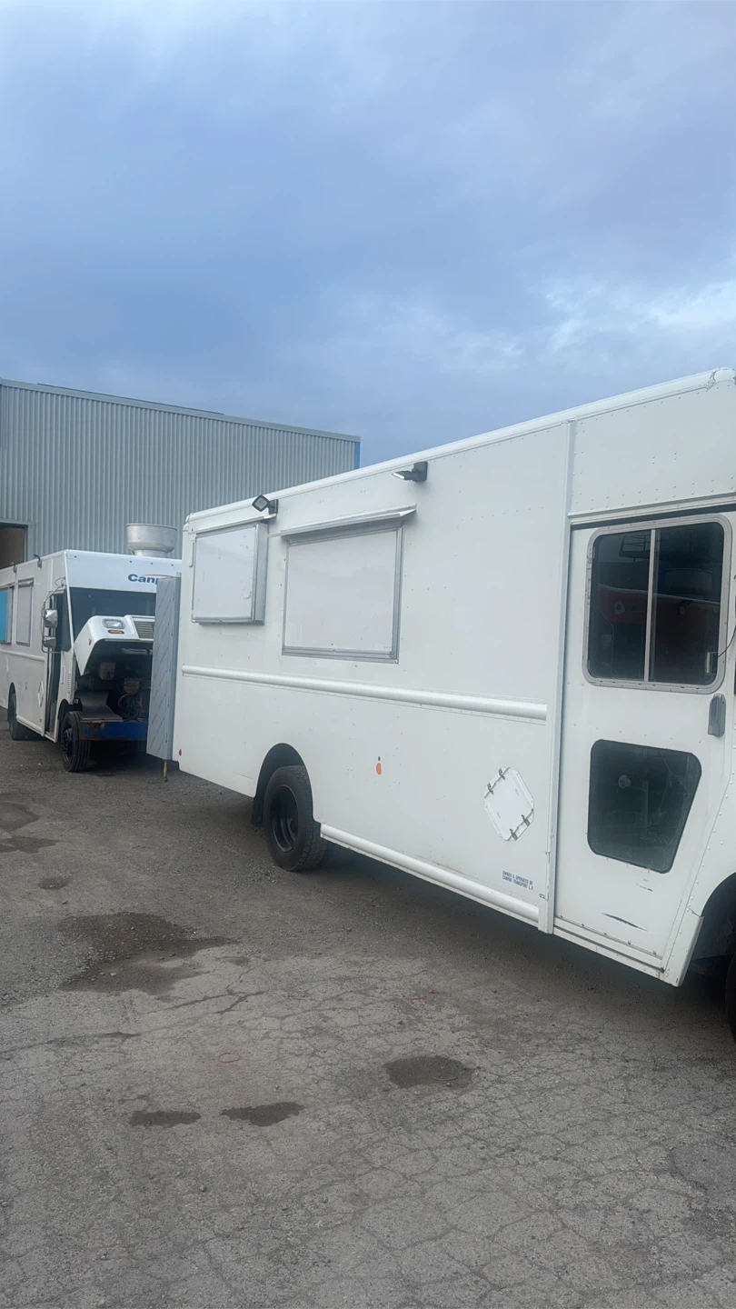 Fully equipped commercial food truck interior with stainless steel surfaces. Features include a multi-compartment sink, stovetop burners, and a griddle. This setup is ready for a mobile food business. Plenty of counter space and storage.