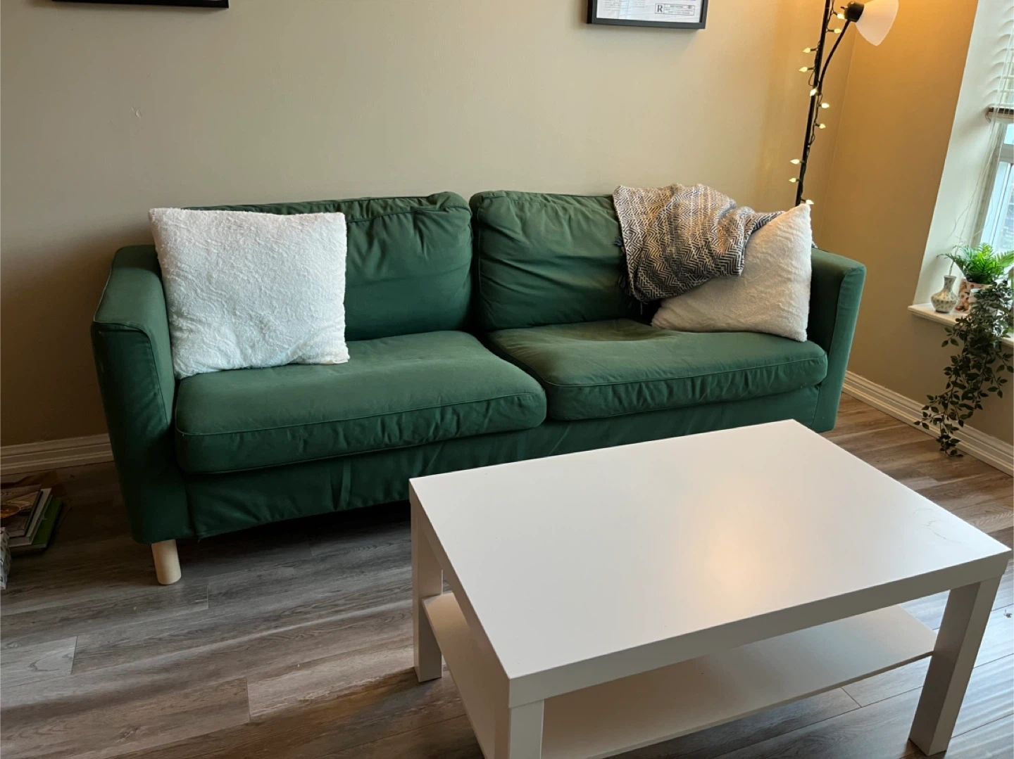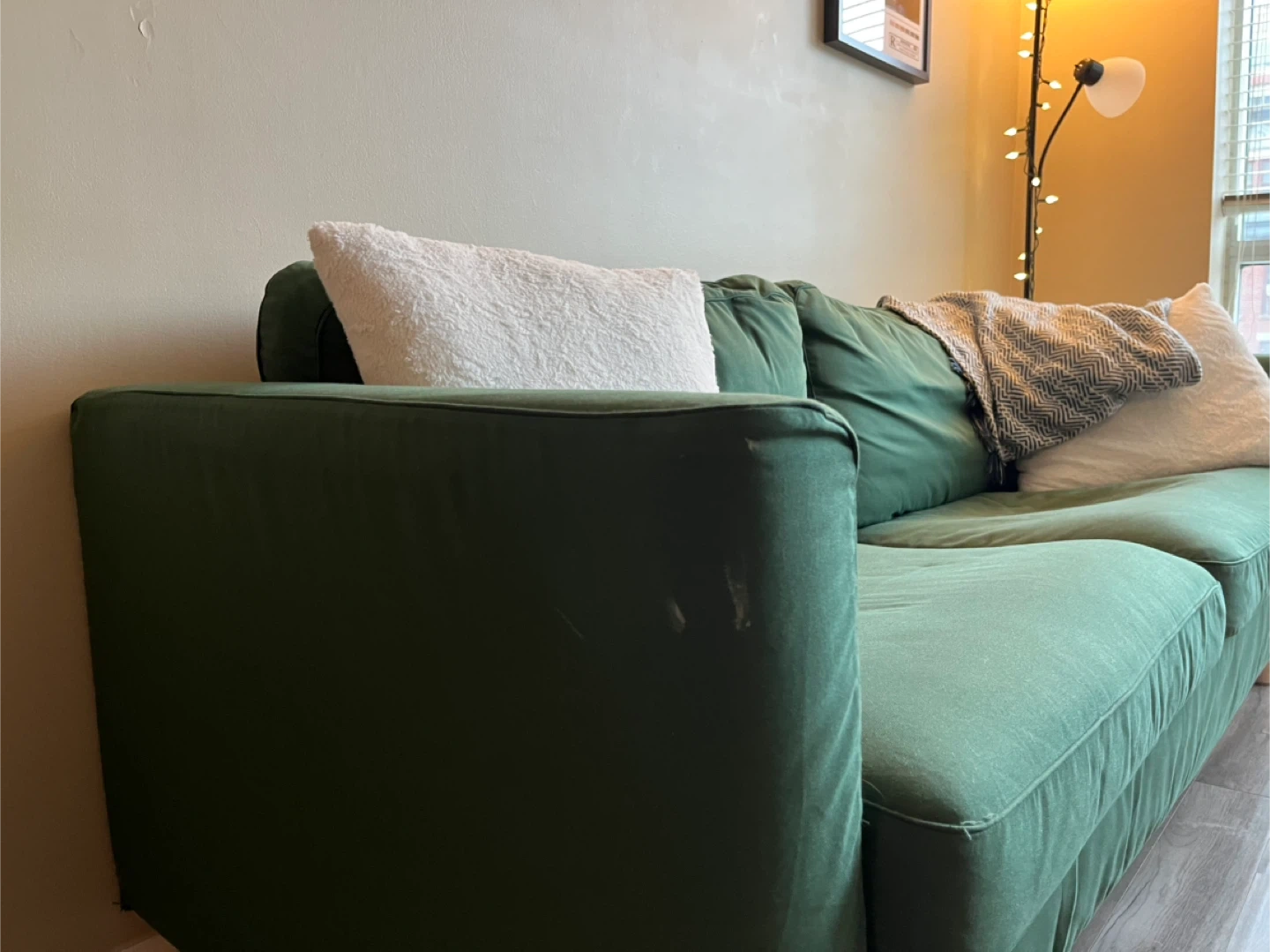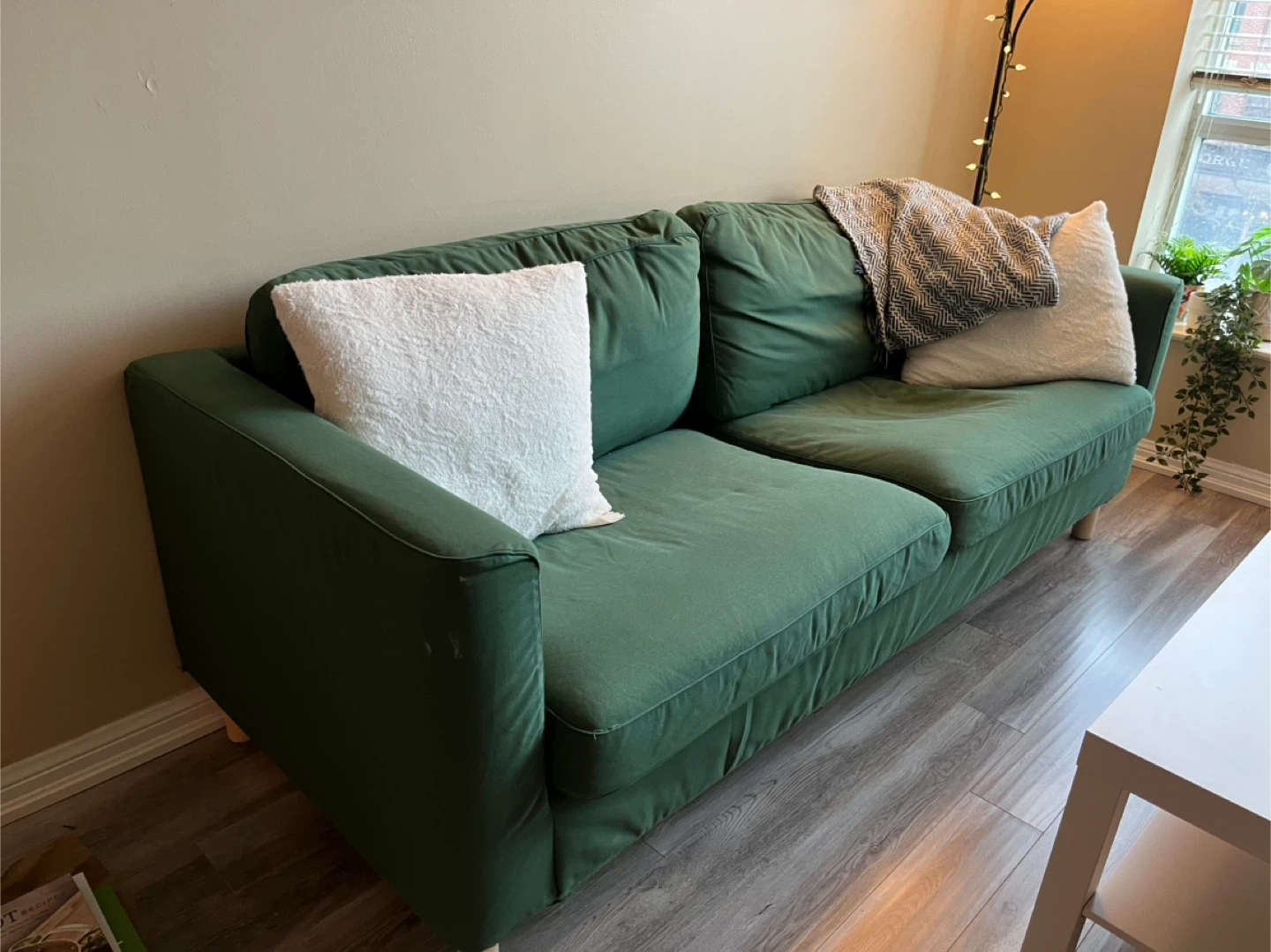 Selling my forest green Karlstad couch from IKEA (discontinued model). Very comfortable and well loved. Small stain on the right arm that can be easily removed (pictured). Covers are removable and machine washable.