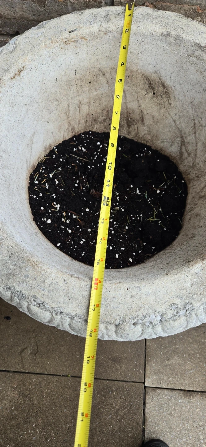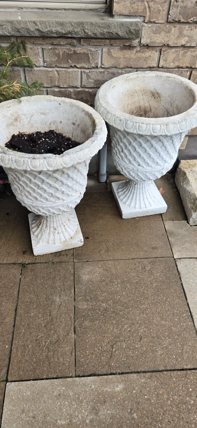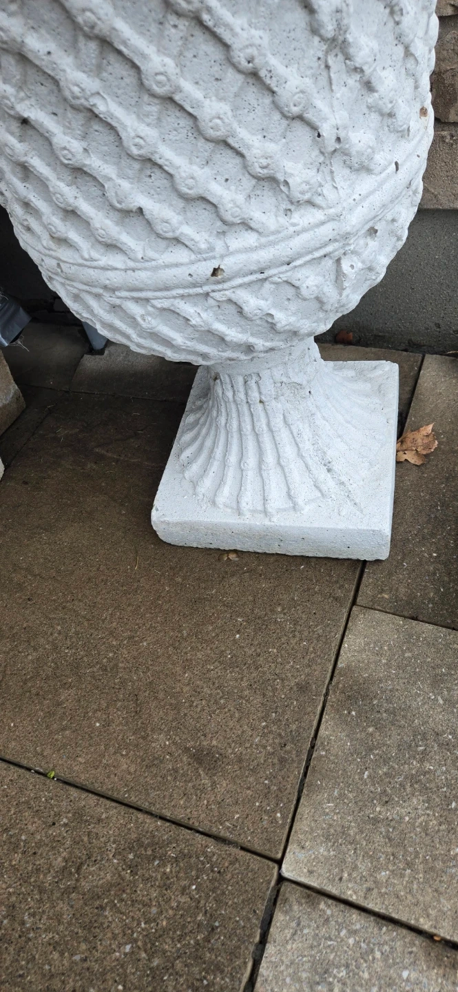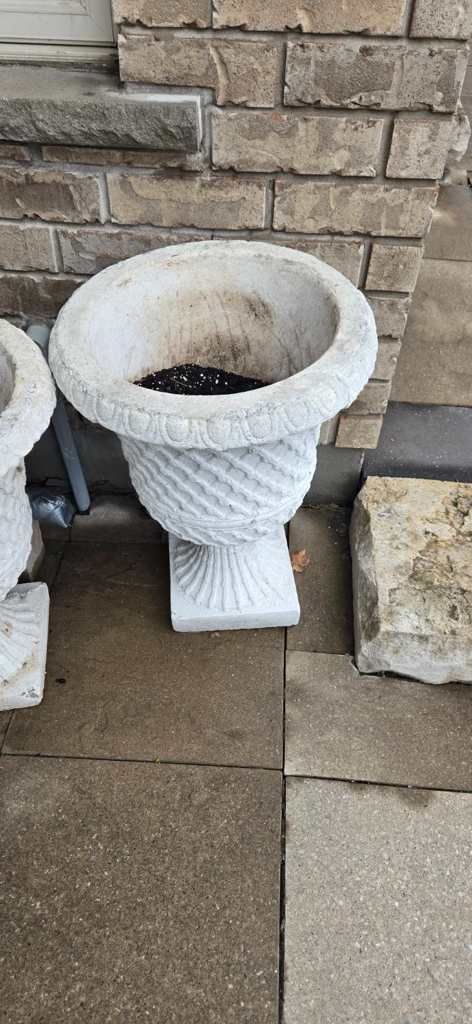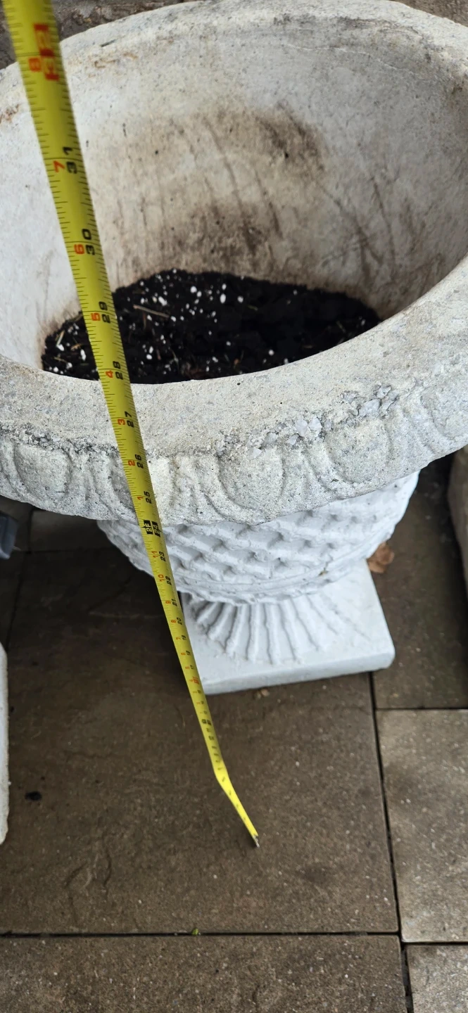 Heavy concrete urn planter for your garden or patio. It has a detailed, classic design. Roughly 24 inches tall. Opening 16 inches.