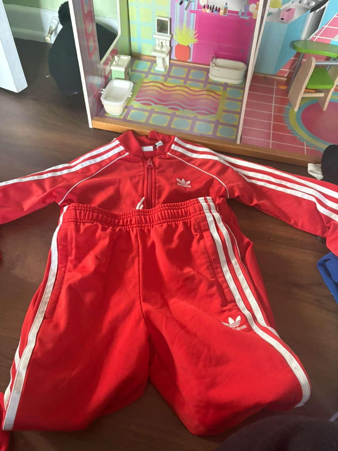 Two-piece Adidas tracksuit set in vibrant red. Includes a full-zip jacket and matching pants. Features the classic Adidas three stripes on both pieces. Great for active kids!