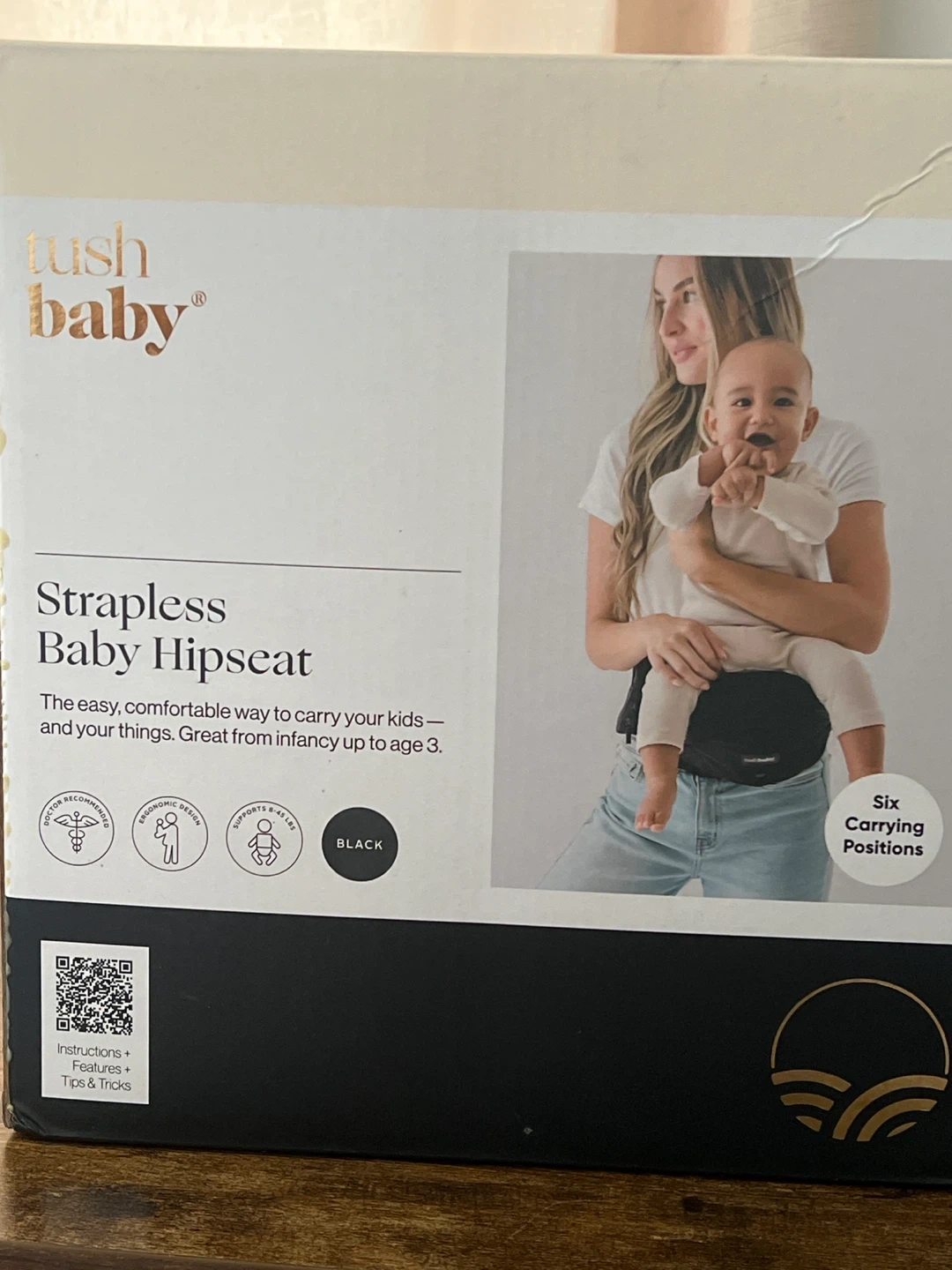 Selling a Tushbaby Strapless Baby Hipseat in black! It's the easy, comfortable way to carry your kids and your things. Great from infancy up to age 3. It has a cushioned seat, anti-slip seat patch, and a safety buckle. There's also a large storage pocket and two side pockets. The ergonomic hipseat provides lumbar support and lightweight portability. The box is included!