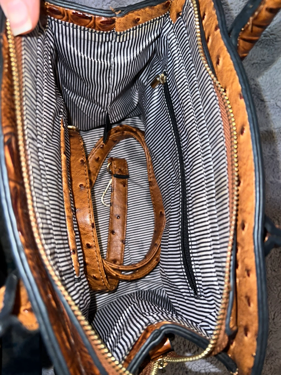 🤎 Brown croc ostrich textured handbag with gold lock detail and structured shape.