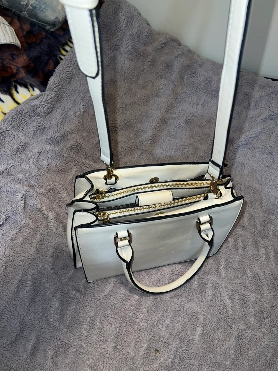🤍 White handbag with gold zipper details and both top handle + long shoulder strap.