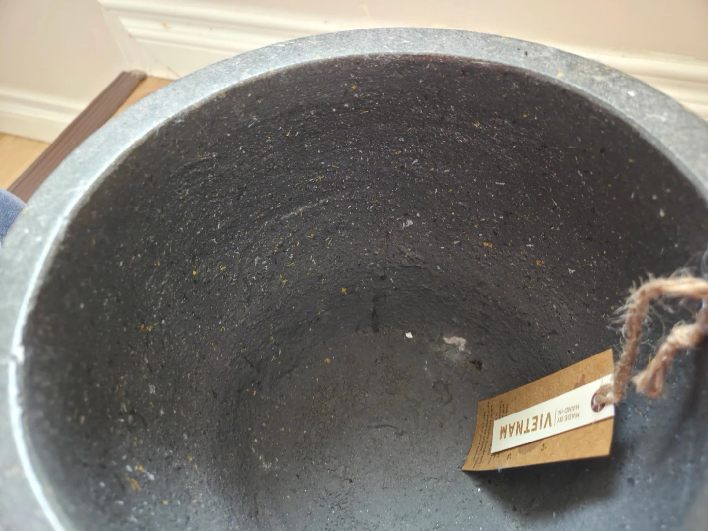 A speckled grey planter pot comes with a wooden stand. It's made in Vietnam and has a unique textured finish. This pot's design makes it suitable for any indoor plant.