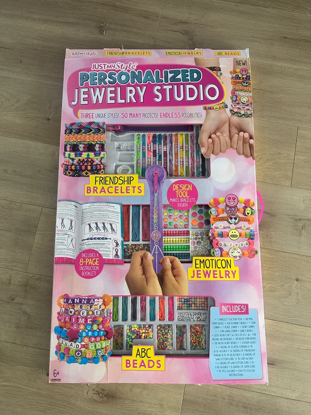 This kit includes everything needed to create personalized bracelets and emoticons. It comes with pony beads, alphabet beads, charms, and various cording and thread. It also includes a bracelet suction tool and a design tool for making bracelets easier! It has been opened but not been used.
