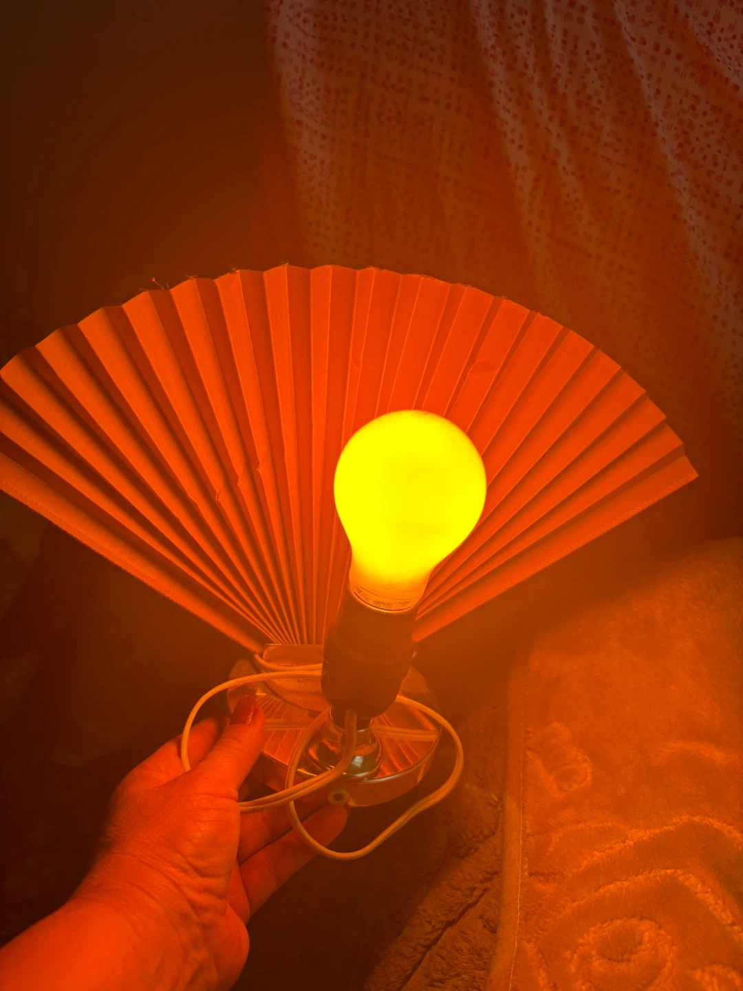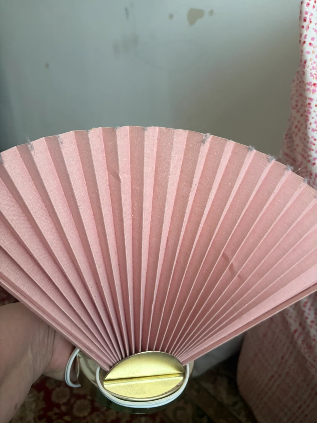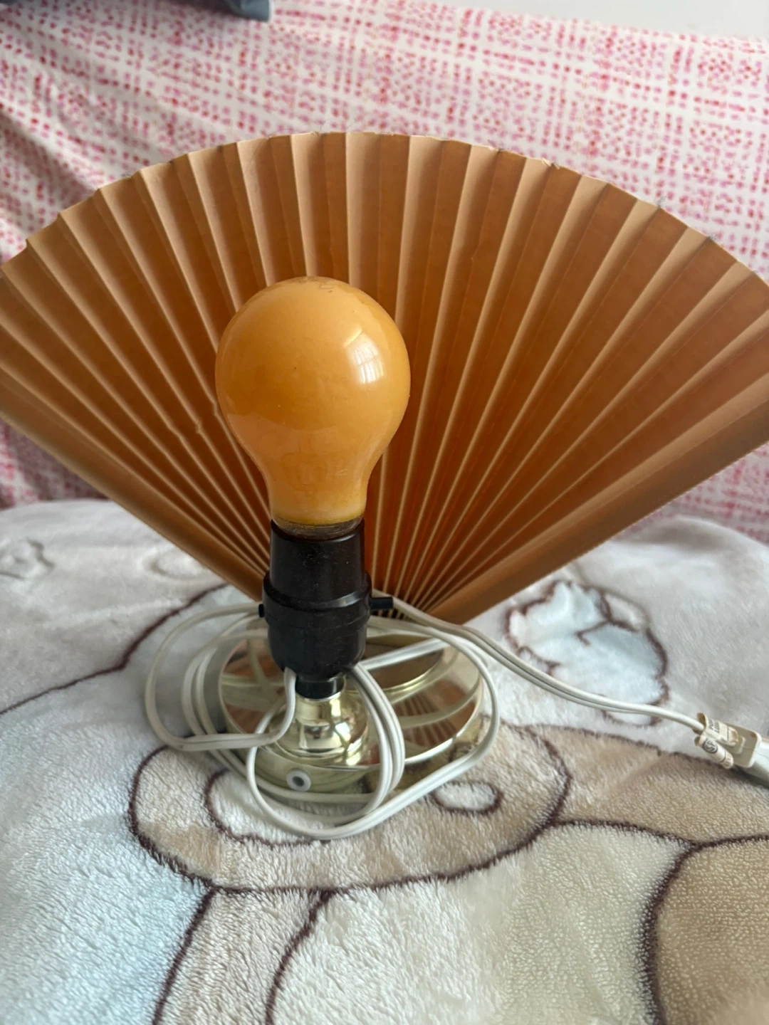 This unique table lamp features a pleated, fan-shaped shade that resembles origami. It's a charming piece for adding a soft glow to any room. The lamp has a simple base and cord.