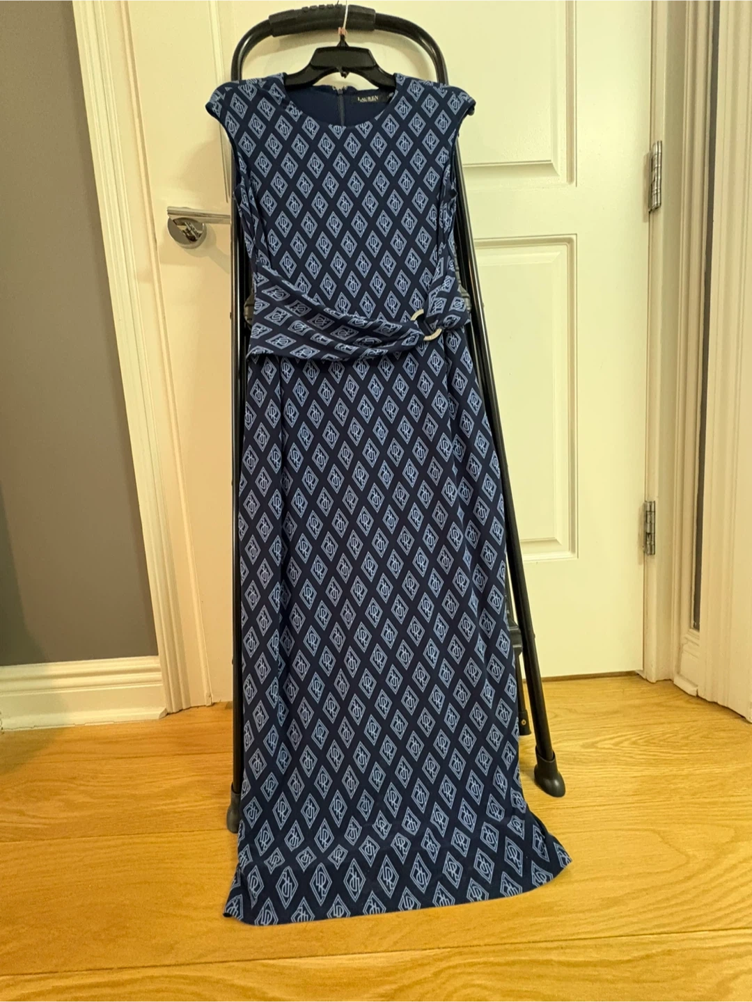 Lauren Ralph Lauren navy maxi dress with a geometric print. It features a flattering wrap-style bodice and a full, flowing skirt. Size 4.