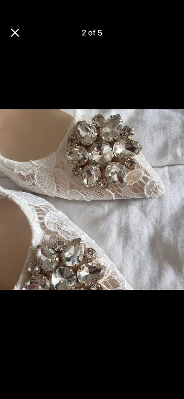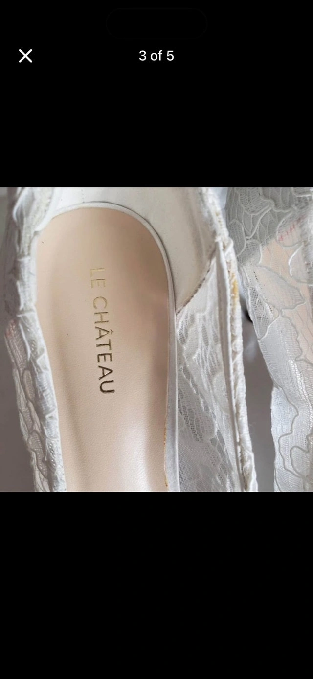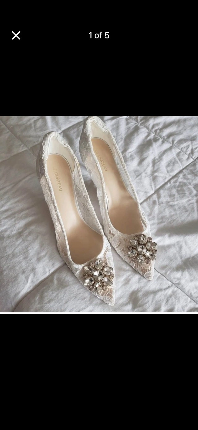 These Le Chateau heels are a European size 40, adorned with intricate lace and sparkling jewel embellishments, perfect for adding a touch of elegance to any special occasion outfit. These shoes are in good condition, ready to make you feel like Cinderella! Brand: Le Chateau Size: European 40 (approximately US 9) Colour: White Detail: Lace overlay with jewel embellishments If this ad is still up, the item is available! Don't be shy, these heels are waiting for their next grand adventure!