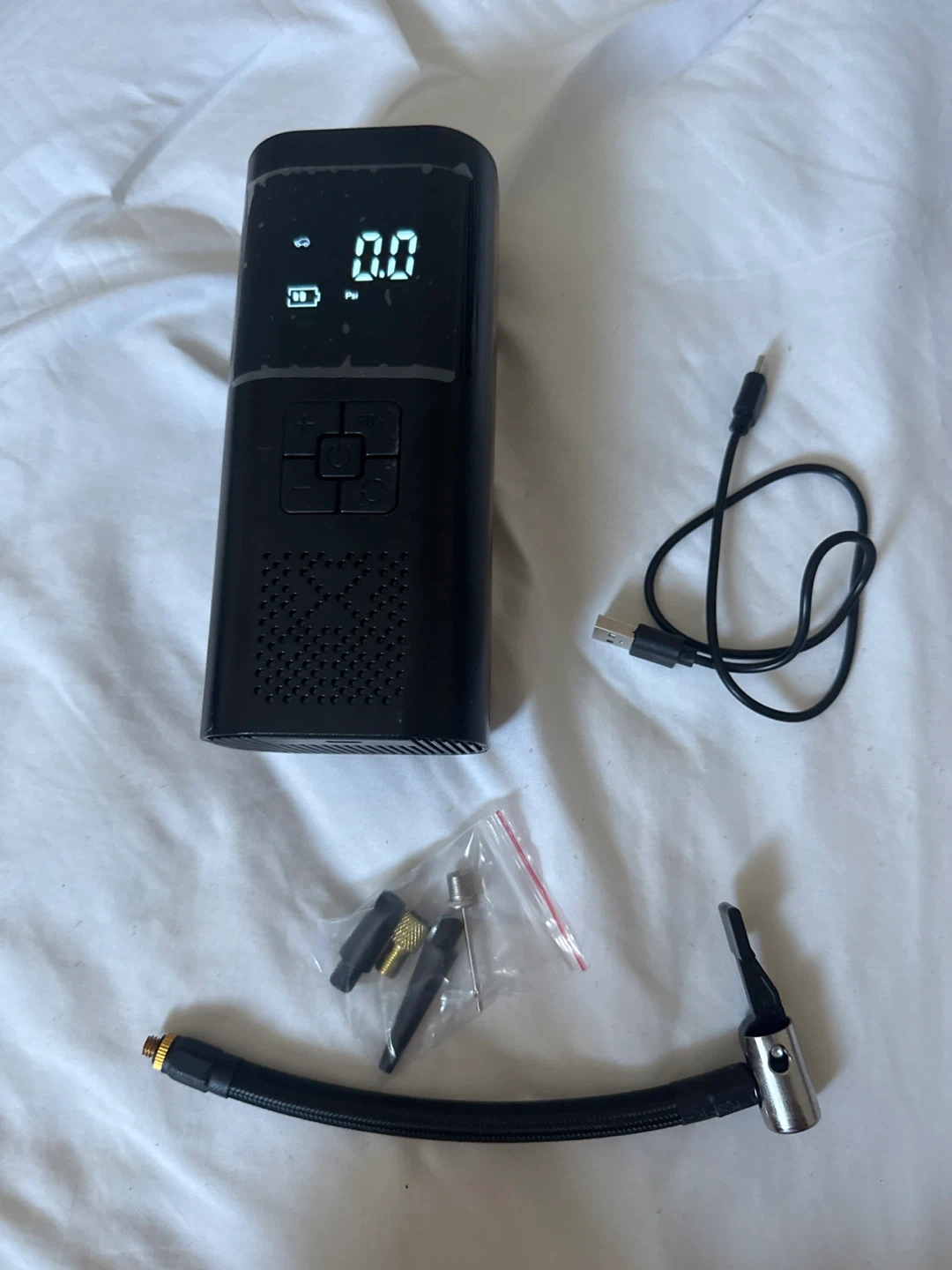 This is a portable digital air compressor. It comes with a charging cable and various nozzle adapters for different uses. The digital display shows pressure readings.