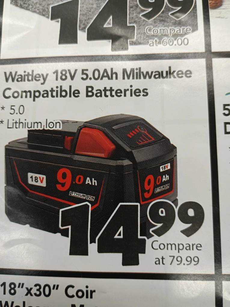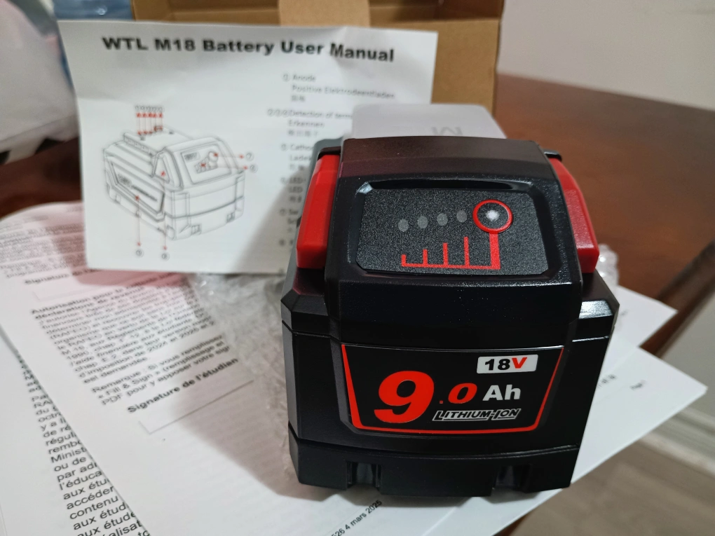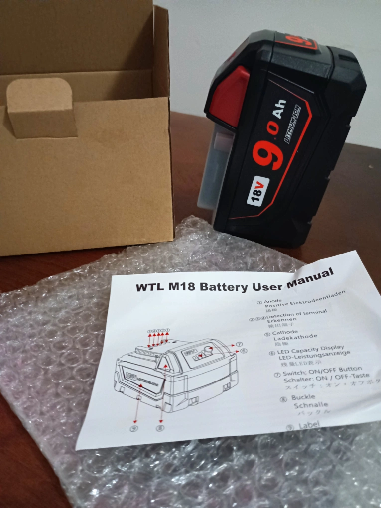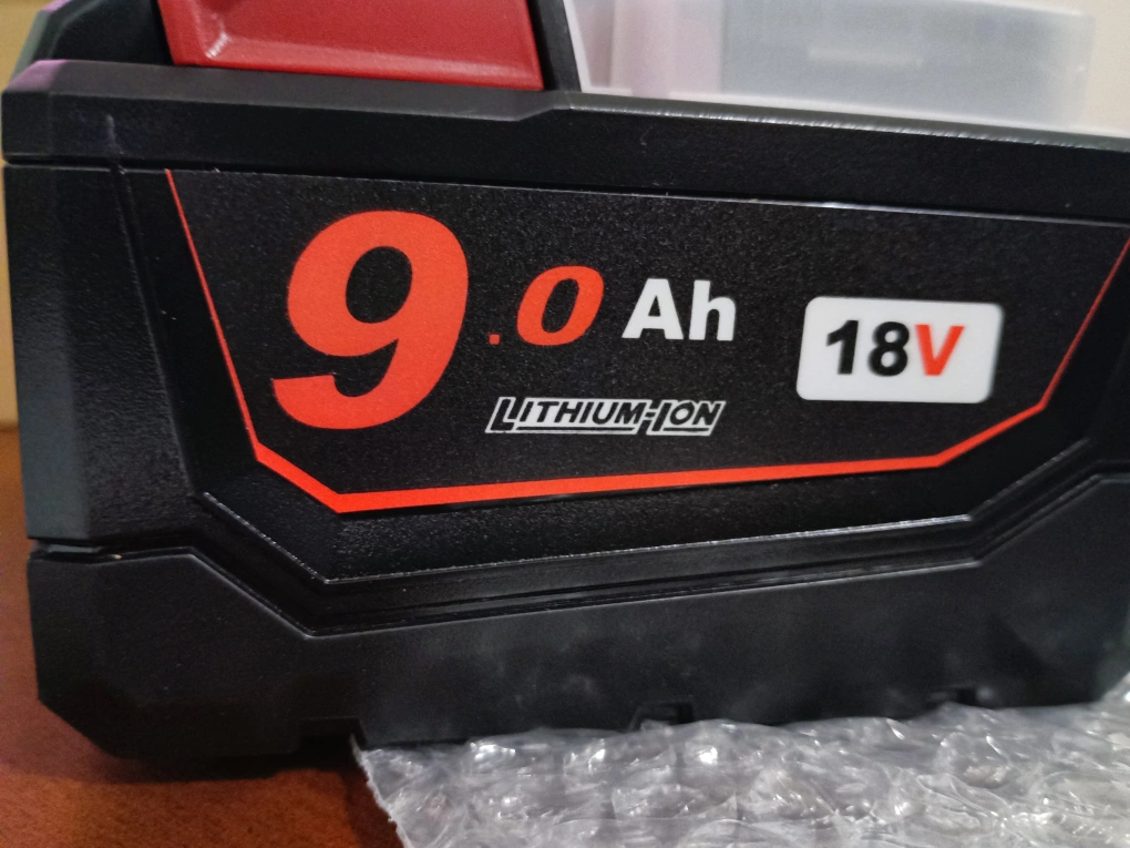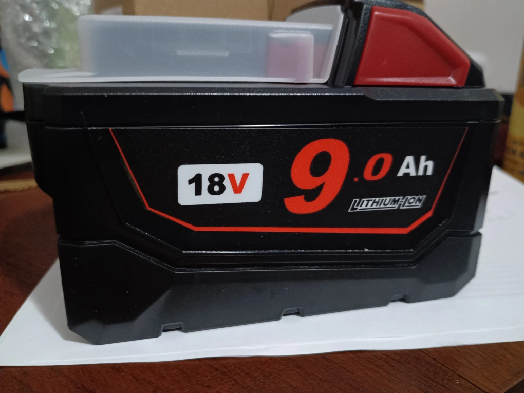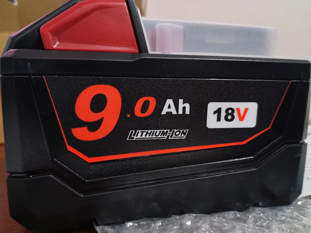 A rechargeable 9.0 Ah 18V Lithium-Ion battery. It is black with red accents. This battery is the perfect addition to your tool collection, allowing you to work on projects knowing you have reliable power at your fingertips.campatible with many cordless like Milwaukee and more.